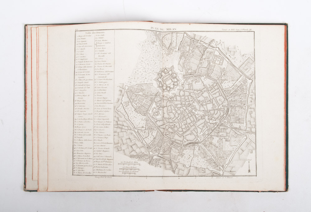 Contains fine, highly detailed plans, provided with extensive legends, of Turin, Milan, Piacenza, Parma, Modena, Bologna, Florence, Rome, Venice, Brescia, Mantua and Genoa, besides a map of the area between Bologna and Ferrara, a double-paged bird's eye view of the ruins of the Greek temples in Paestum and 4 city views in Rome.