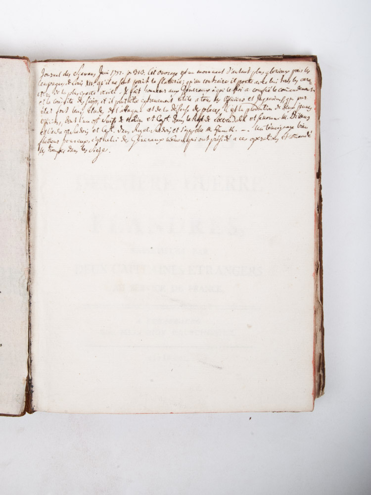 rassemblés par deux capitaines etrangers au service de France [Funck & D'Illens]. Strasbourg, Melchior Pauschinger, 1750, (8),113,(1) p., with folding engraved overview map of Flanders and 24 folding plans of besieged cities, woodcut ornaments at beginning and end of each Journal, contemporary marbled leather with gilt back, 4to.