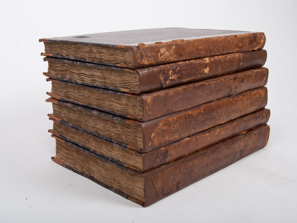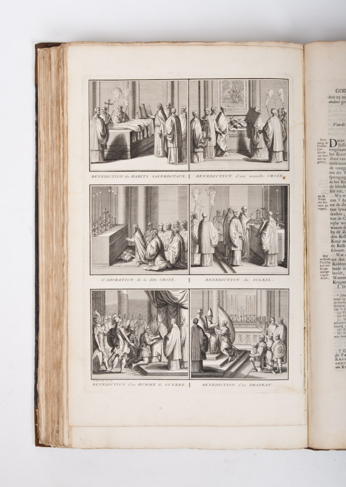 Large folio, 6 vols., uniformly bound, half-leather with marbled cartonnized sides, 6x title in red and black with vignette by B. Picart (1722), (24),387,(3),(1); 32.4,(16),(2); (6),187,(5),229,(5),(2); 424,(29),(2); (6),340,(2),317,(41) pp., 12 vignettes and over 200 engravings, several of which folding and double-paged; the 12 engravings of Jewish customs are missing. Spines with signs of use, endpapers renewed, various waterstains; the copper engravings in bold prints. Monumental work with countless clarifying illustrations of all world religions and of many other religious groups. (6 in total)