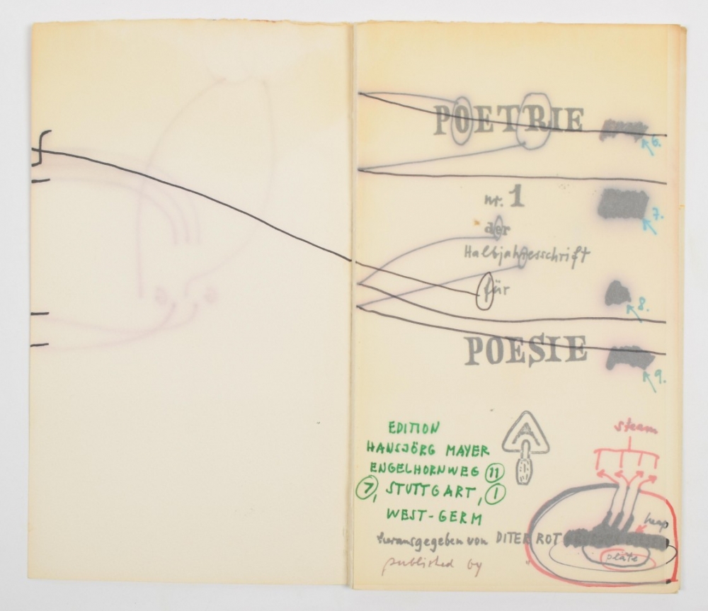 Nr. 1 Der Halbjahresschrift Fuer Poesie. Stuttgart, Edition Hansjorg Mayer, 1966. 25.5 x 14 cm, 26 pp. Letterpress on handmade paper. Edition of 130 signed and numbered copies, of which 80 were reworked by the artists.