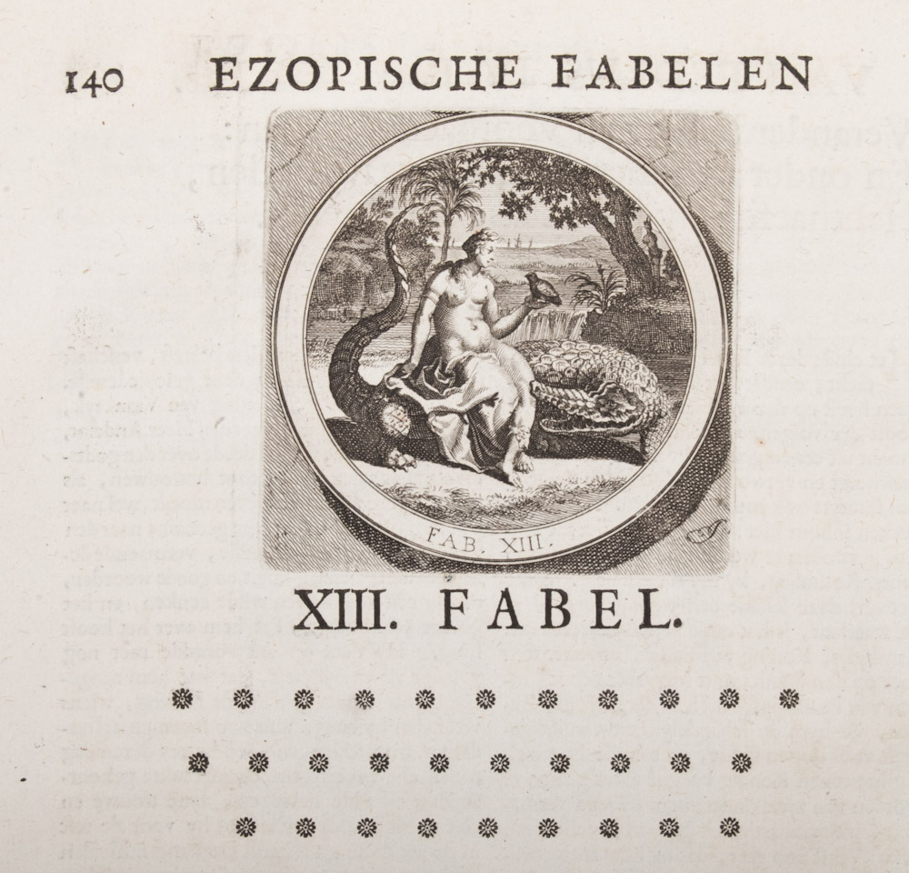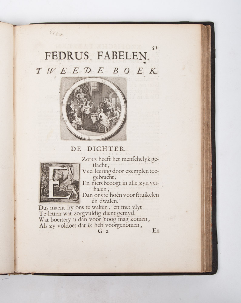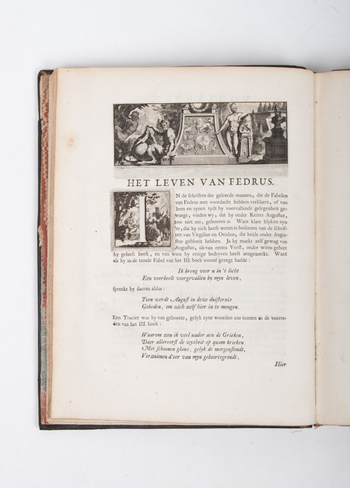 4to., leather, rubbed spine with gilt-stamped title, sides with embroidery and ornamental gilt-stamped decorations, marbled endpapers, expertly reinforced, frontispiece by J. Goeree and P. Boutats, title in red and black with vignette, (32),198,(12) pp., in front a folded and coloured portrait of David van Hoogstraten by A. Boonen, P. van Gunst and F. Halma, var. vignettes and incl. 104 in-text illustrations of the fables by J. van Vianen; in clear prints and on extra sturdy paper. Beautifully made copy with signs of use.