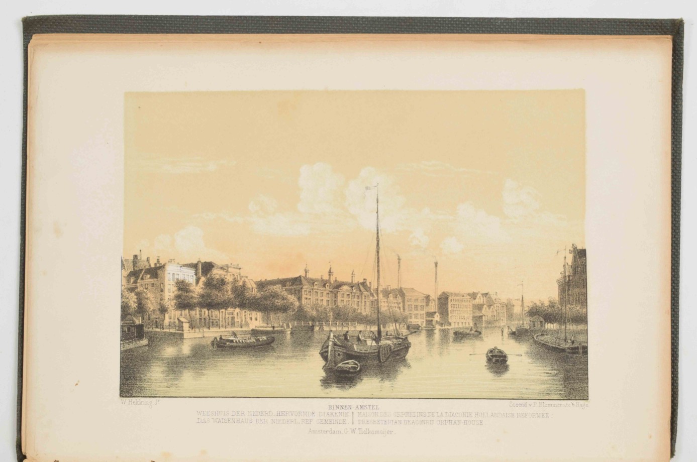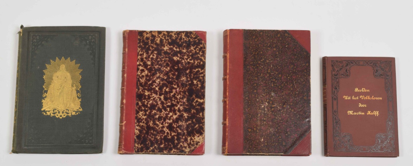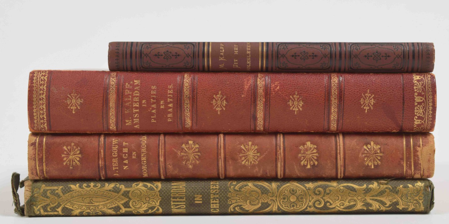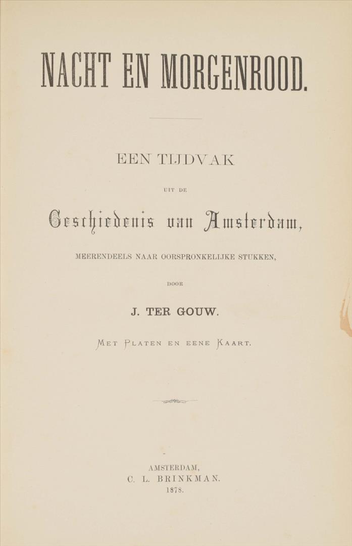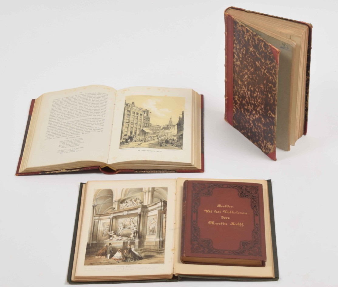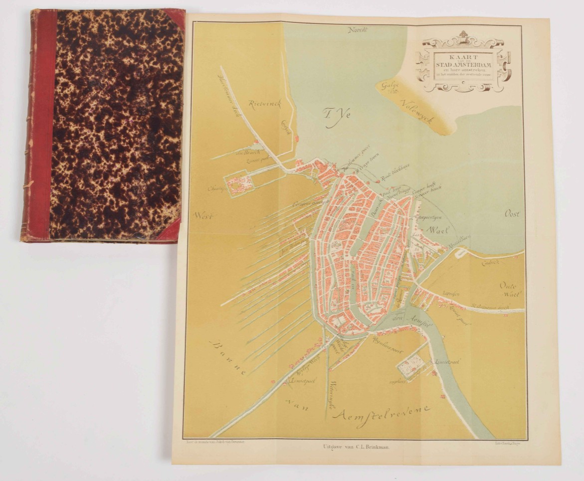 One plate with attached text leaf loose; spine ends worn/ sl. dam. First series only; (2) Nacht en morgenrood. Een tijdvak uit de geschiedenis van Amsterdam (...) door J. ter Gouw. Met platen en eene kaart. Amsterdam, C.L. Brinkman, 1878, XV,(1),262,XXVI p., w. large fold. chromolithogr. map and 3 tinted lithogr. plates, contemp. gilt half mor., 4to. Leather sl. rubbed. With pencil annotation on first free endpaper: "Geschenk van den schrijver". And 2 more, by Martin Kalf. (total 4)
