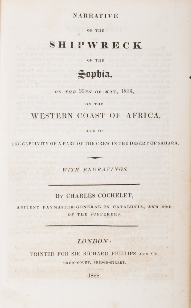 On the 30th of May, 1819 on the Western Coast of Africa and of the captivity of a part of the crew in the desert of Sahara. Charles Cochelet, ancient paymaster-general in Catalonia, and one of the sufferers. London, printed for Sir Richard Phillips and Co., 1822.
