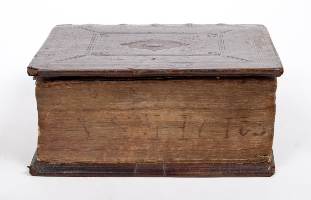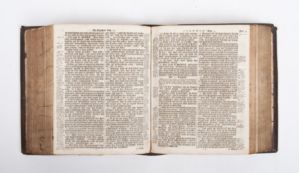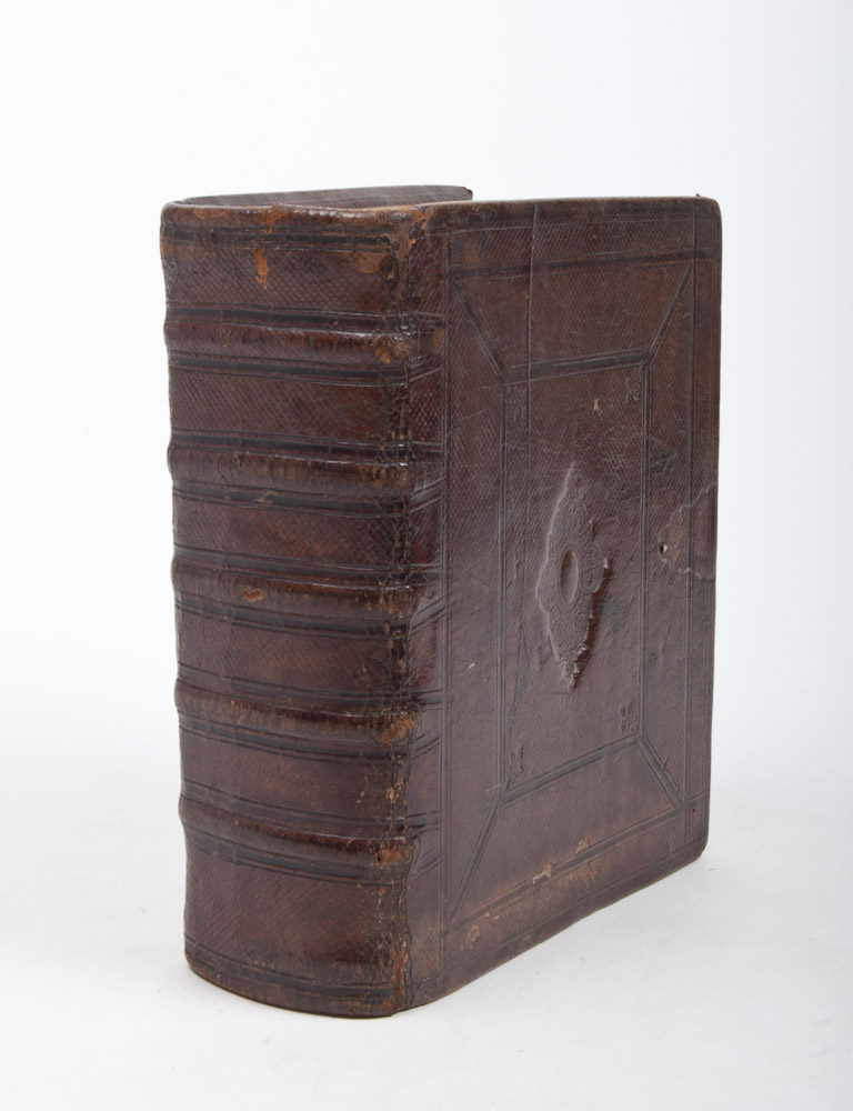 Bound in leather, clasp missing, inlaid ornaments. Copper engraving on frontispiece. (20) 329 pp + 125 pp + 149 pp + (4) 81 pp (34), light waterstain on first pages and light indent on top binding (see picture). Canonijke boeken, Capittelen, ende Folien des Ouden ende des Nieuwe Testaments; De Boeken der Propheten; de Boeken des Nieuwen Testaments. Psalter in back.