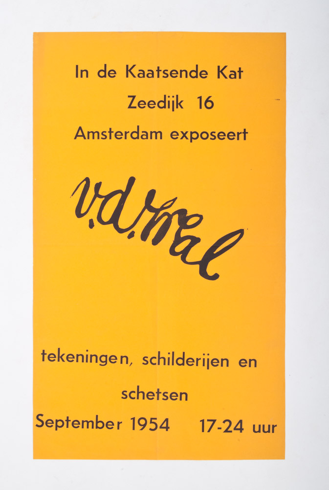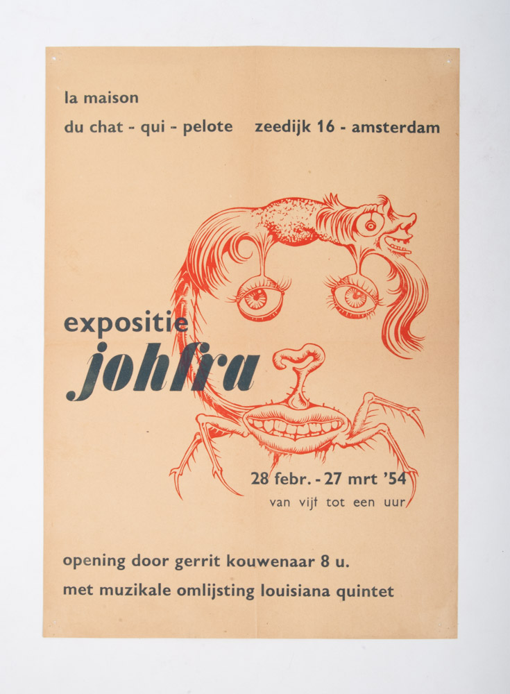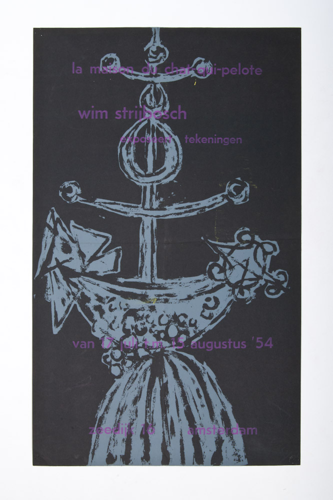 Wim Strijbosch exhibits drawings, July - August 1954, La Maison du Chat qui Pelote. 62 x 38 cm. + Exhibition Johfra. Opening by Gerrit Kouwenaar, February-March 1954. 50 x 35 cm. Thumbtack holes. + In de kaatsende kat - v.d.Wal, drawings, paintings and sketches. September 1954. 50 x 29.5 cm.