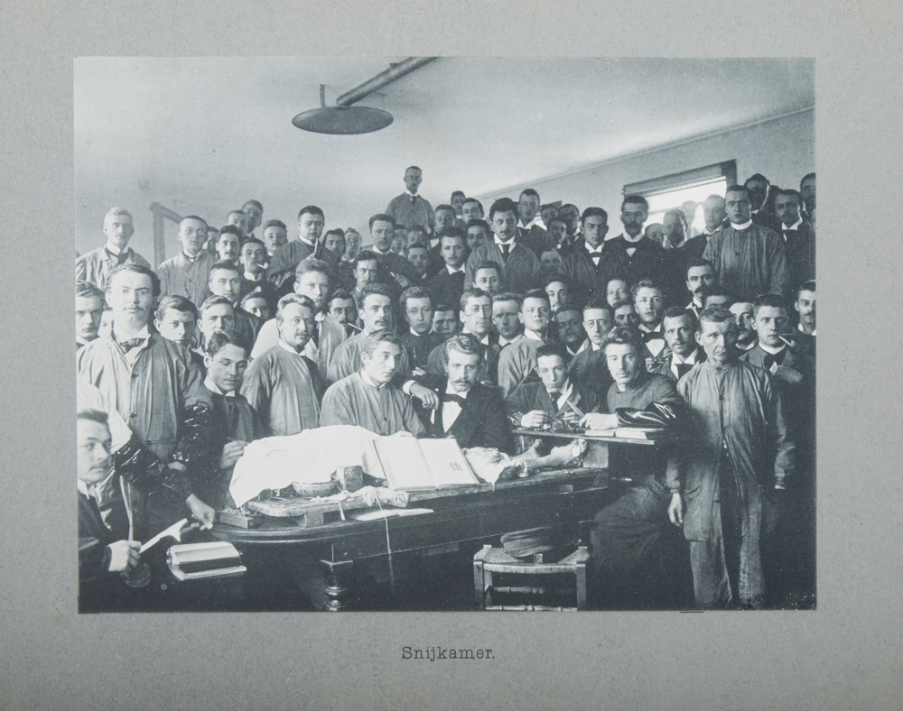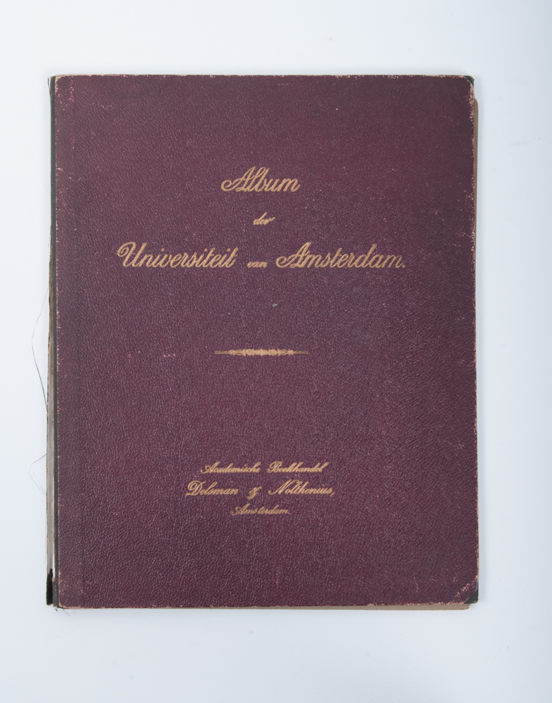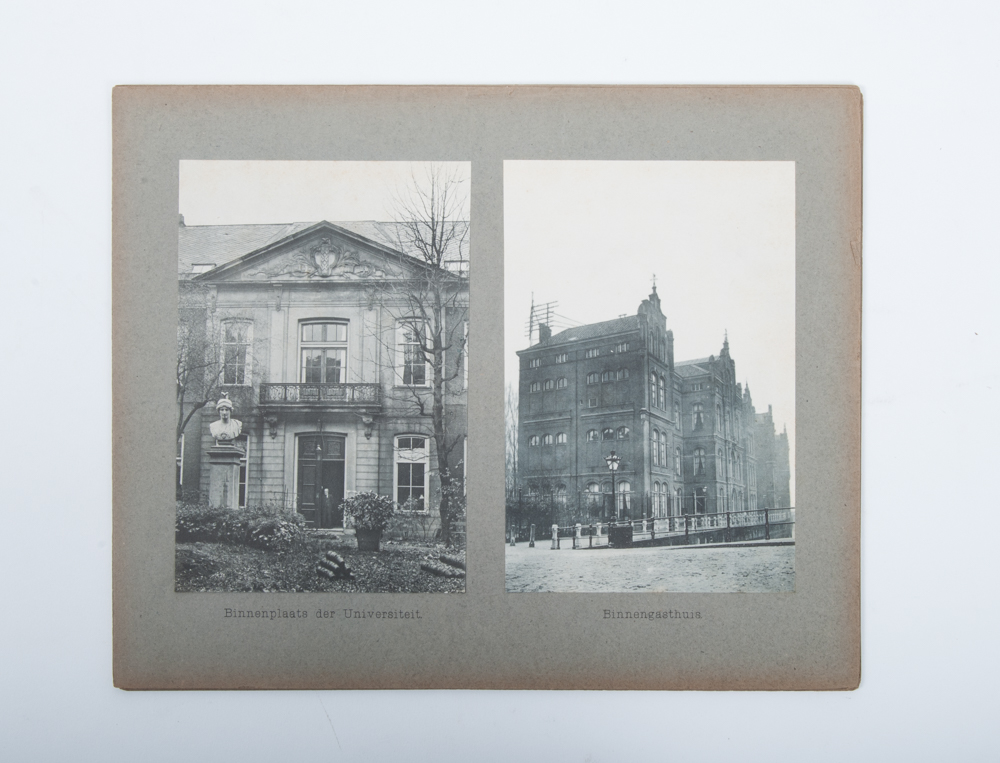 Academische Boekhandel Delsman, Nolthenius Amsterdam, 1902. 12 p. Photos in orig. maroon folder, containing the following collotype photos: 1. Pharmaceutisch Laboratorium. 2. Physiologisch laboratorium. 3. Leeszaal. Universiteits Bibliotheek. 4. and 5. Hortus Botanicus. 6. Auditorium. Physisch Laboratorium. 7. Snijkamer. 8. Scheikundig laboratorium. Werkzaal der Philosophen. 9. Collegezaal anatomisch Laboratorium. 10. Senaatskamer. 11. Collegezaal Aquarium Gebouw. 12. Aula. 13. Scheikundig Laboratorium. Werkzaal der Philosophen. 14. Natuurkundig Laboratorium. 15. Binnenplaats der Universiteit. 16. Binnengasthuis.