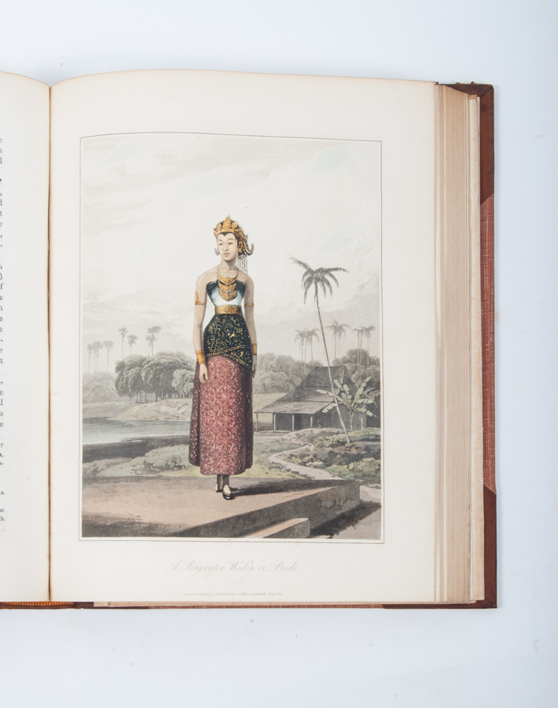 2 vols., uniform binding, half leather with leather corners, spine with title in gilt stamping, top edge gilt, XLVIII,479; VIII,288,(4),CCLX pp., a large folding map by J. Walker in steel engraving, coloured, with inserts of various bays and harbours and a mineralogical sketch of Java; 2 frontispieces, 65 aquatints/engravings, 10 of which hand-coloured costume plates. Of this first edition, only 900 copies were printed. Remains the great standard work on Java. Fine set. (total 2)