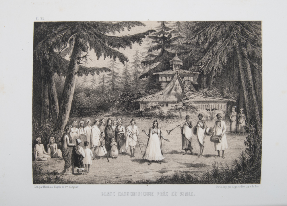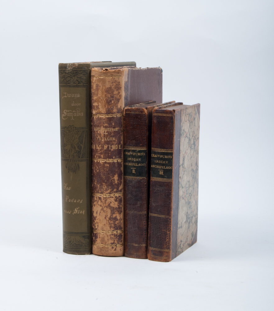 4to, original green cloth binding with title on spine and front cover in black and gilt stamping, XVI,536 pp. with a folding lithographic map at the back and 68 illustrations, 1 of which loose, with a few tanned pages at the front and back; together with: History of the Indian Archipelago: containing an account (...) by John Crawfurd, with maps and engravings, Edinburgh, Archibald Constable, 1820, vol. II and III and: Voyages dans l'Inde par le Prince Alexis Soltykoff, 3me ed. Paris, Garnier Freres with numerous bicoloured lithos. (total 4)