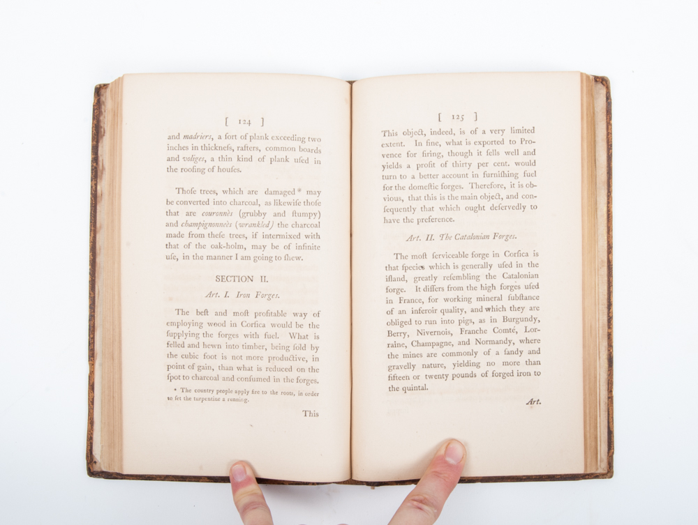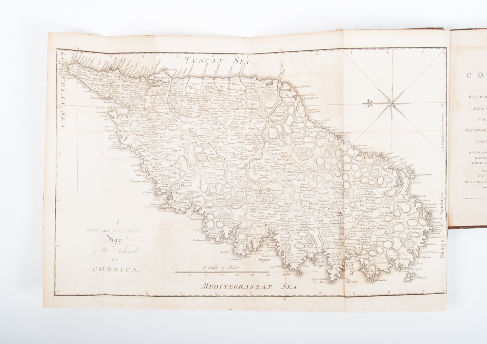 with an account of its union to the Crown of Great Britain. Including the Life of General Paoli, and the Memorial presented to the National Assembly of France (...). By Frederick [de Neuhoff], son of the late Theodore, King of Corsica. Londen, G.G. and J. Robinson, 1795, VIII,211 p., with large folding engraved map, contemporary marbled leather, spine gilt with morocco title shield and repeated arms with helmet, sabre, pistol and palm.