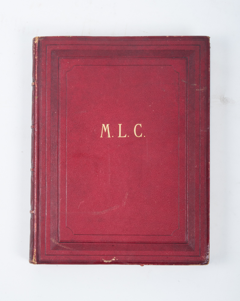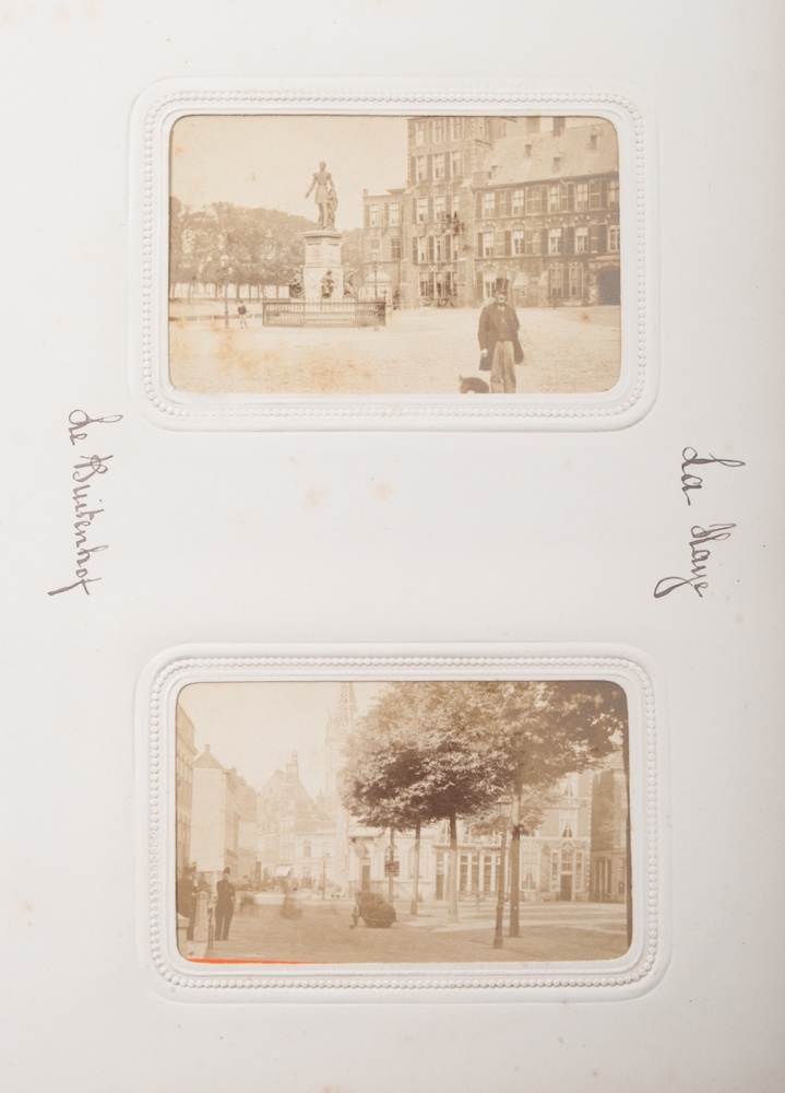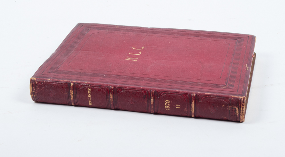 Album with 14 leafs, each with 8 inserted photos, ca. 1890, mostly views of Dutch cities but also several famous Dutchs art works and traditional dress, each 10.5 x 6.5 cm. (carte-de-visite size), with title in pen on the album leafs, the album bound in red morocco with gilt lettered title "Hollande" and "1879 II" on spine and initials "M.L.C." on front cover, edges gilt, large 4to.