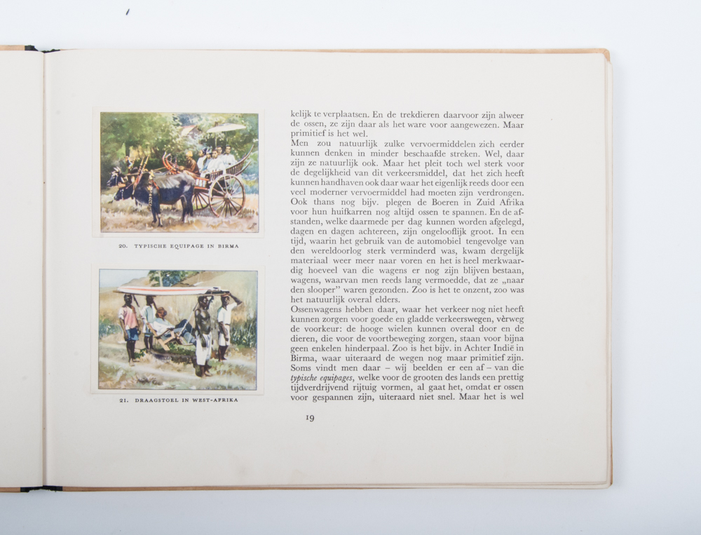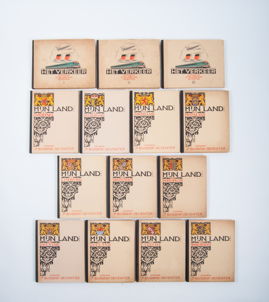 Vol. I-XI. 1927-1937. Text G.J. Nijland. Complete series each with 100 pictures and 2 large plates. All in half cloth in good condition. Additionally several promotional leaflets for the albums + Het Verkeer vol. I, II and III, 1938-1948. Text G.J. Nijland, oblong, half cloth, all complete with 96 pictures and 2 large plates in good condition.