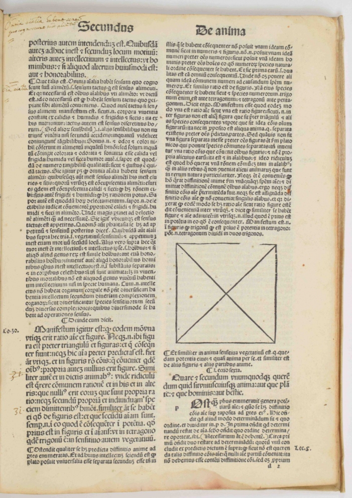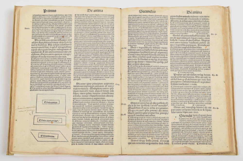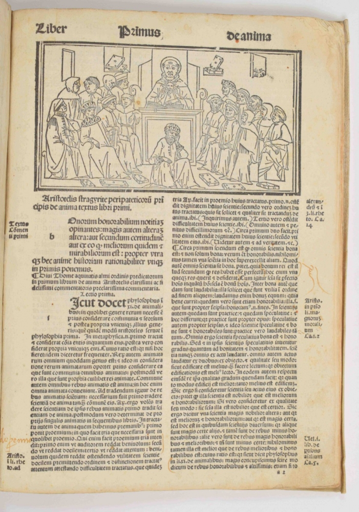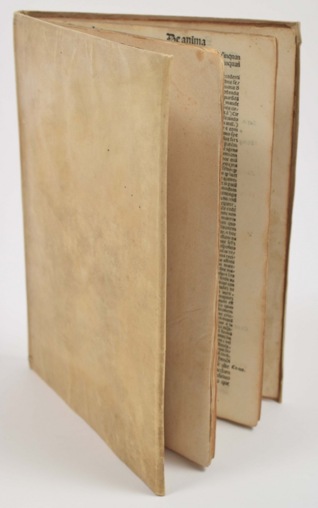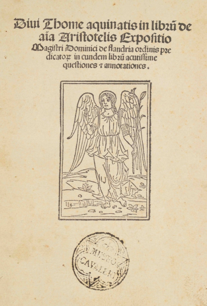 Partly waterst. in lower blank margin; occas. contemp. annotations in pen; upper corner of bookblock partly rounded. Old manuscript title on lower edge of bookblock. A good copy, with stamp "Museo Cavaleri" on the title p. Michele Cavaleri (1813-1890) was a prominent lawyer in Milan, who collected a vast number of paintings, sculptures, antiquities and books. He negotiated with the city council of Milan to create a museum for his collection, but the council declined. Ernesto Cernuschi bought the entire collection in 1873 and it was shipped to Paris. Cernuschi died in 1896, part of the collection survives at the Musée Cernuschi in Paris, but much of it was sold. Also with the bookplate (on upper pastedown) of Louis Joseph Marthe Corten (1922-1990), former mayor of various places in the province of Limburg. Finally, with small bookseller's ticket of Het Oude Boek (Nijmegen) on lower pastedown. A beautifully printed, rare early edition of Aquino's treatise on the important philosophical work De Anima (On the soul) by Aristotle.