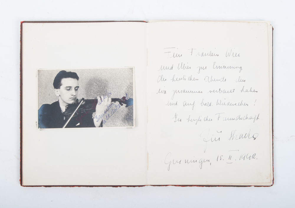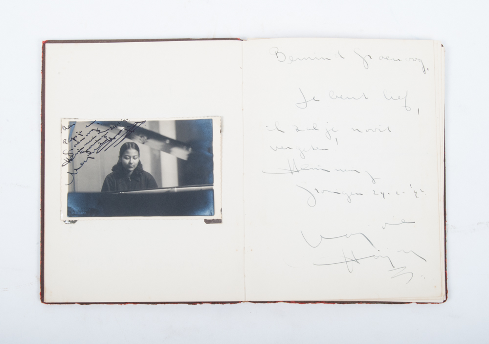 It becomes clear from the contributions that Mies Stork and Wies were visited by various famous (international) musicians in Groningen around 1942, especially in March that year. The album contains contributions by: Corry Bijster (1905-1998, opera diva, dedication in pen); Györgi Faragó (1913-1944, pianist, signed photo and a signed and dated dedication in German); Ji?í Shacko (?) (violin player, signed photo and signed and dated dedication in German); Marjorie Hijan (?) (pianist, photo with signed dedication and separate signed dedication, both in Dutch and dated); Henk Viskil (tenor and Matthaeus Passion specialist, photo with signed dedication and separate signed dedication); Lucien Louman (1896-1952, concert singer, signed photo with "Voor Mies Stork" on the reverse and a separate signed and dated dedication); Miek Engelenburg (1908-?, pianist, signed and dated dedication and a photo); Tibor de Machula (1912-1982, cellist, signed and dated dedication); Emil Telmányi (1892-1988, violin player, portrait postcard with signed, dated dedication on reverse, sent to Mies Stork, Groningen).