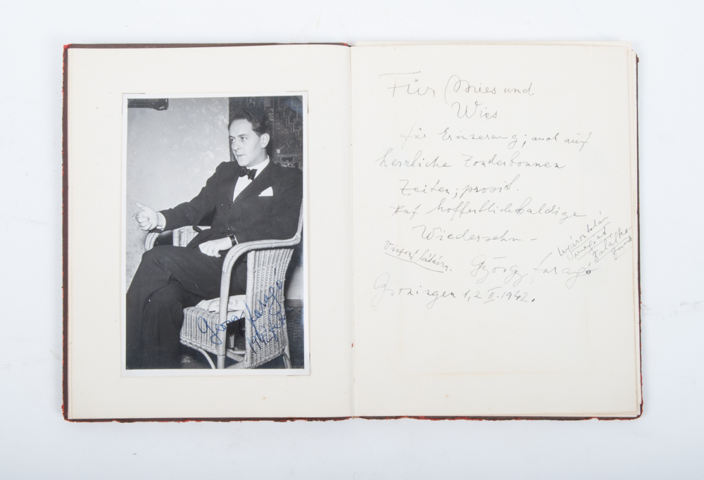 14 pages with handwritten signed contributions and (signed) portrait photos, pasted in corners, of various musicians. dated "18/XI/1940" to "20 XII 1942", and with a large number of empty pages, contemporary cardboard, 23 x 18 cm.