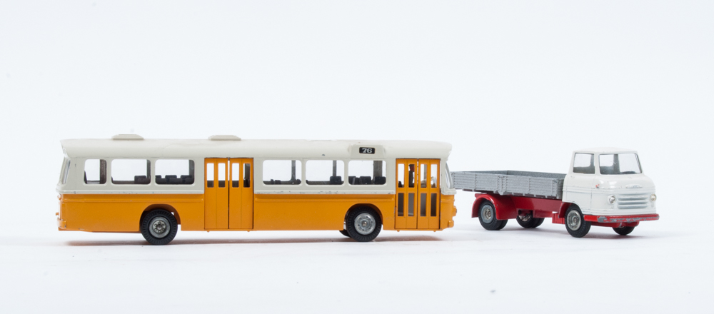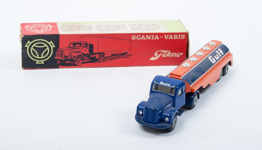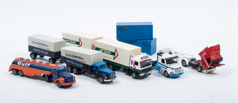 Scania-Vabis Gulf tank lorry 447 in box (box damaged on one side) + 1 other without box + Scania CR 76 bus without box + Scania Vabis J.A. van Spronsen BV internationale transporten, without box + 3 others + several loose parts, including three boxes.