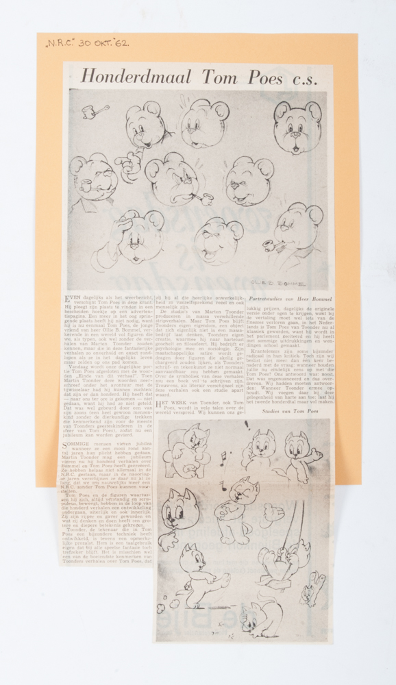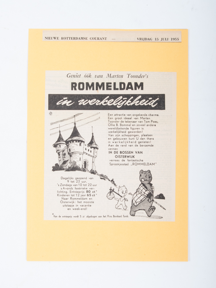 Notice "Geniet ook van Marten Toonder's Rommeldam in werkelijkheid." Nieuwe Rotterdamse courant, Friday 15 July 1955 + several notices from NRC 1948 for Tom Puss Weekly + an advertisement for the Tom Puss jigsaw puzzles, 1948 - and 20 others, including notices for the Rijkspostspaarbank, 1953 and the announcement "Tom Poes met ziekteverlof", NRC, 13 February 1954.