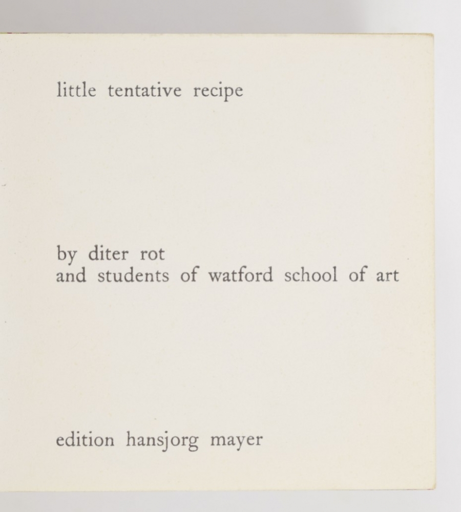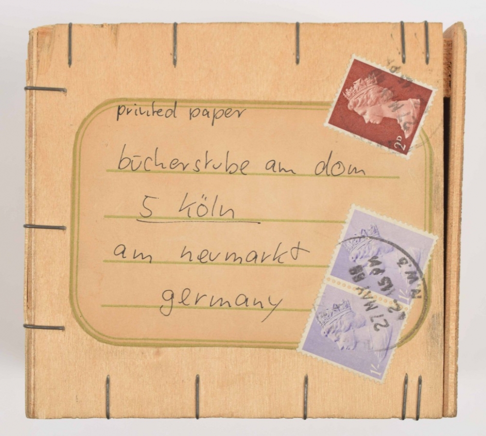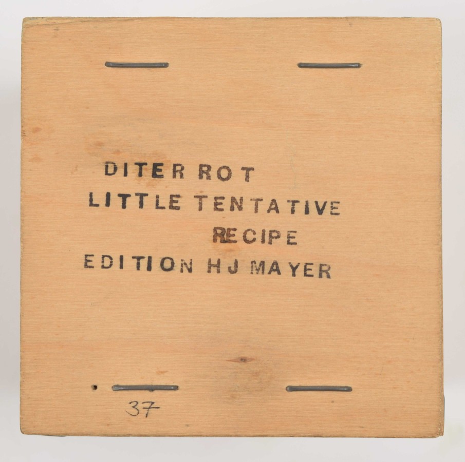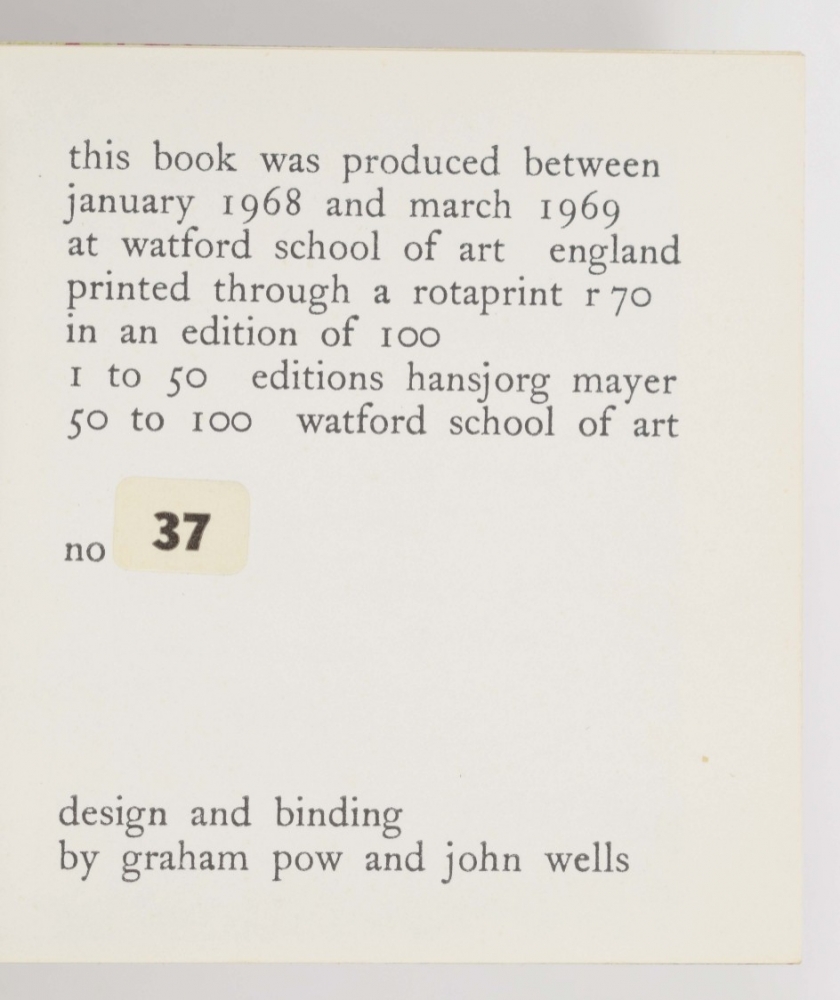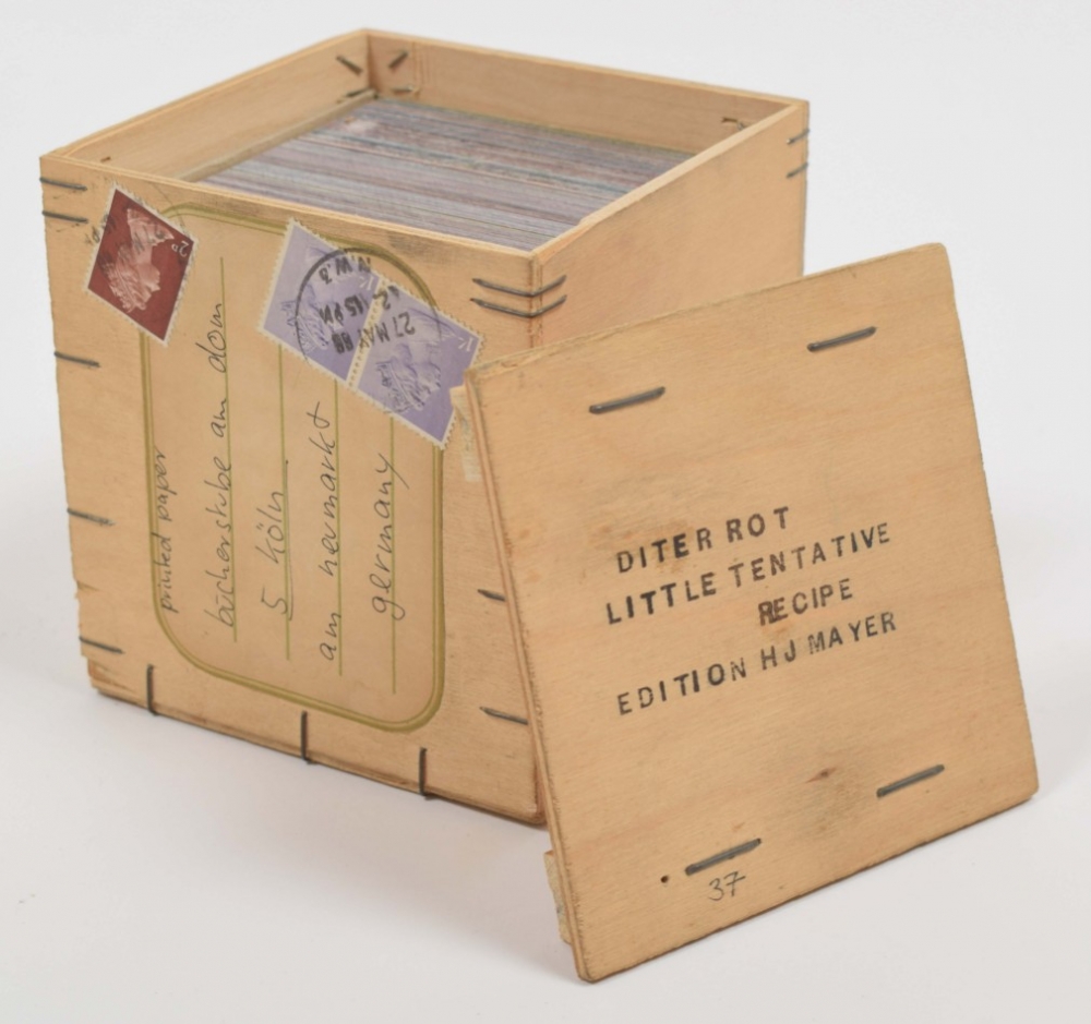 Printed by students of the Watford School of Art according to a 'recipe' of Roth. Edition of 100 signed, dated and numbered copies. This is number 37. The wooden box was mailed, and features an address label for Bucherstube am Dom in Cologne and British post stamps marked 27 May 1968. Very good copy.