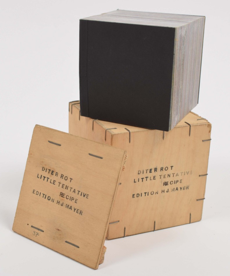 Stuttgart, Edition Hansjorg Mayer, 1968. Miniature book (8.8 x 8.8 x 8.8 cm) made from approx. 800 multicoloured Rotaprints contained in a wooden stamped box (11.3 x 10.3 x 10.3 cm).