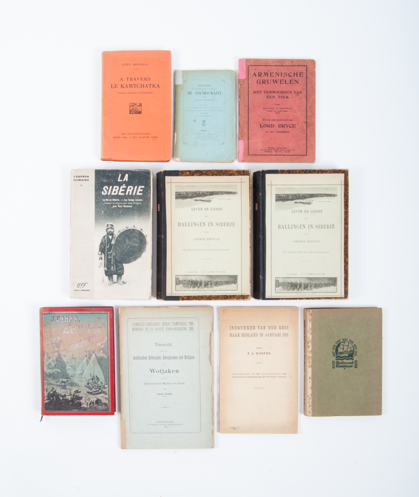 8vo., sewn, red cover with title in black, 243 pp. Combined with: Relation (..) de Stenka Razin, Paris, J. Techener, 1856, Armenische gruwelen by Arnold J. Toynbee with an address by Lord Bryce, Hodder & Stoughton, London etc. [1915] and 7 others, mainly about Siberia.