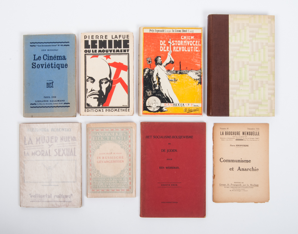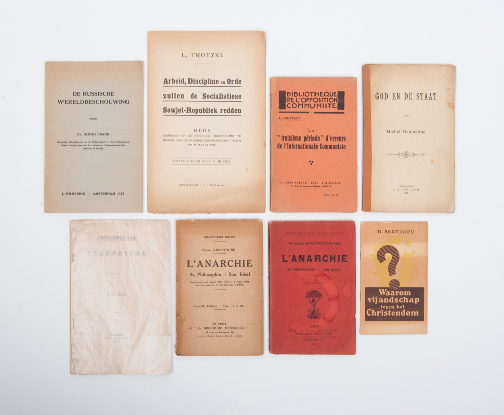 Christelijk Anarchisme, Felix, Haarlem, Vrede, 1898, Het Socialisme-Bolsjewisme en de Joden door een werkman (Thomas Hodgskin), Beekman, Gendringen [1920], God en de Staat, Michel Bakoenine, Amsterdam, Fortuyn, 1888 and 15 others including several French first editions about anarchism.