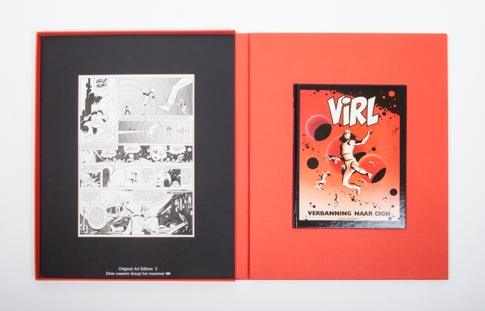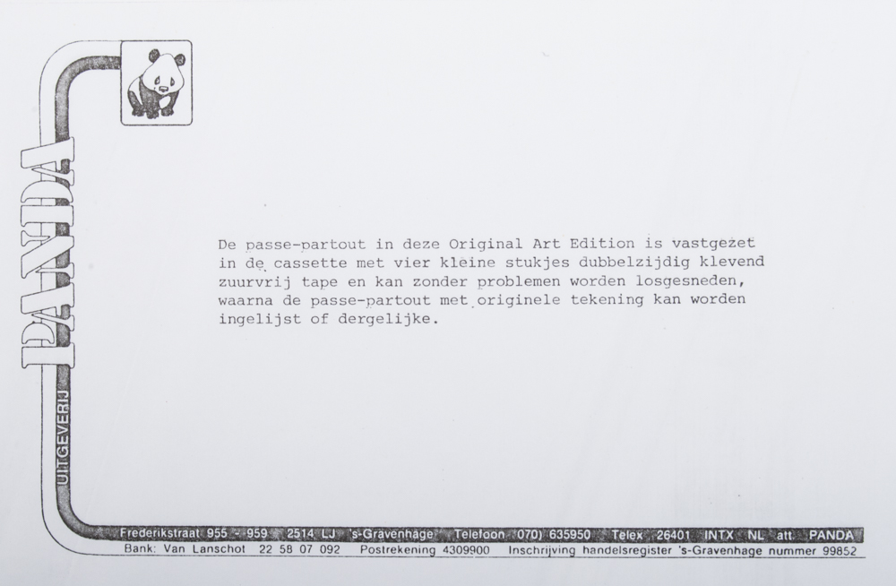 Uitgeverij Panda, 1981. Luxurious red cloth cassette with original page in India ink. Number 59 of 61 numbered albums signed by Matena.