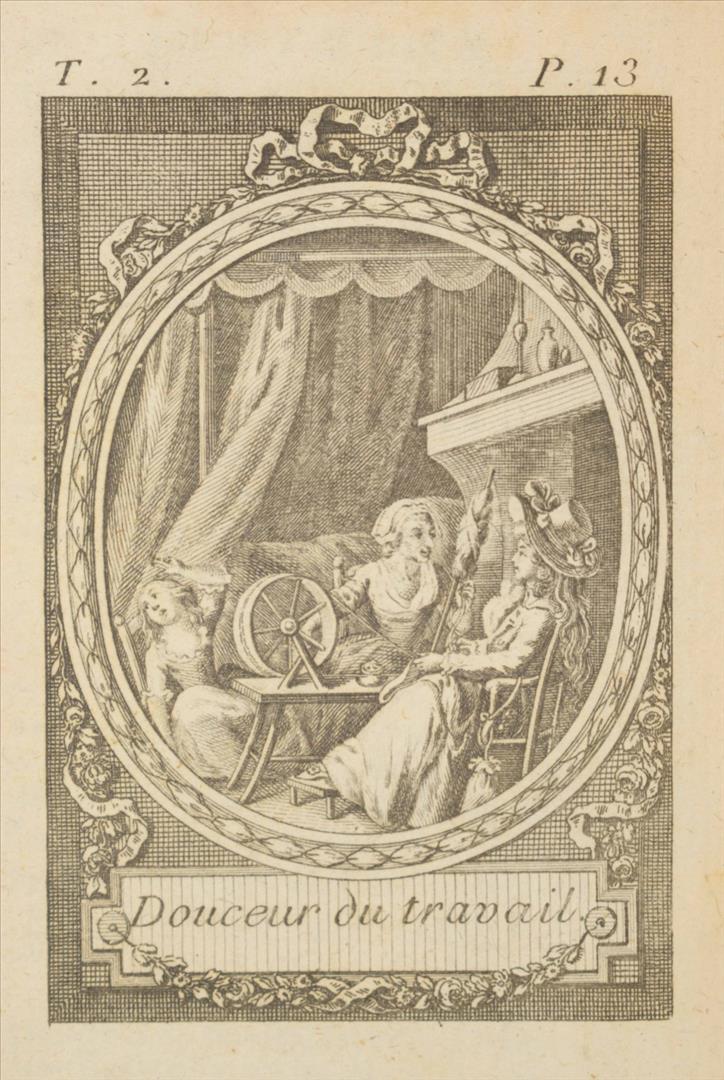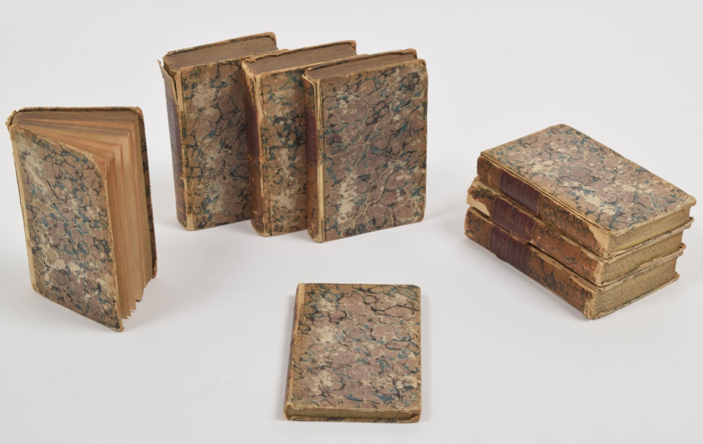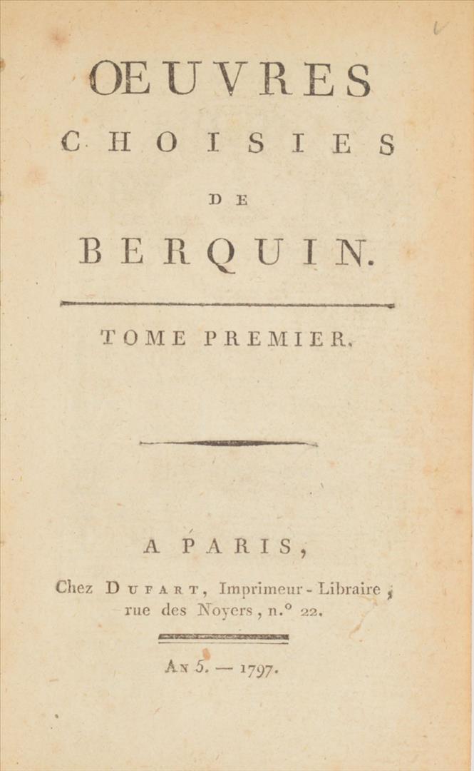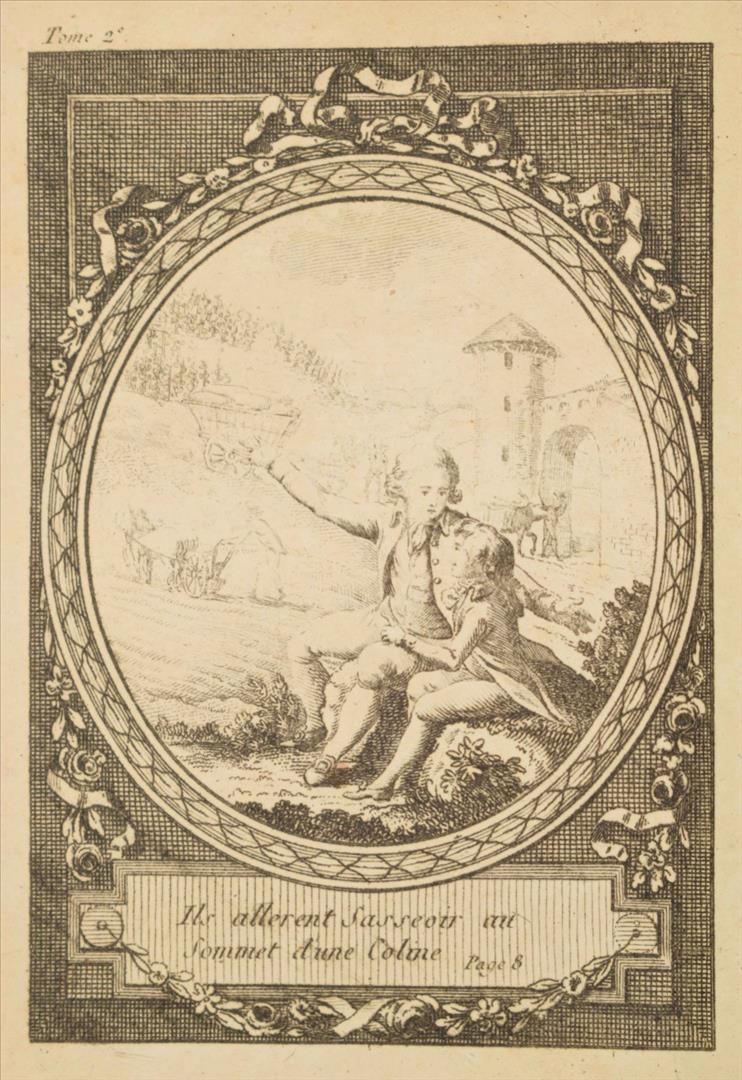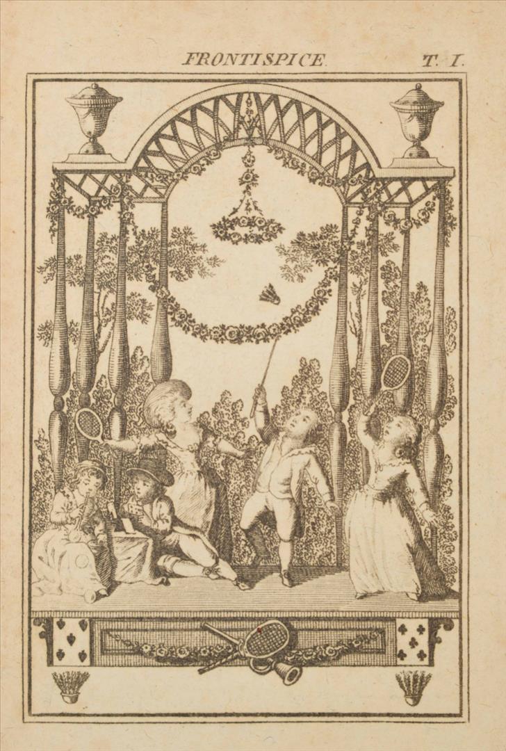 Paris, Dufart, 1796-1797. 16 parts in 8 vols. With 15 engraved frontispieces and 30 engraved plates. Marbled boards, spine with red gilt title label, 12mo. Contains titles such as: L'ami des enfants, Théatre de l'enfance and Introduction familières a la connoissance de la nature (with 14 plates of animals, plants and birds).