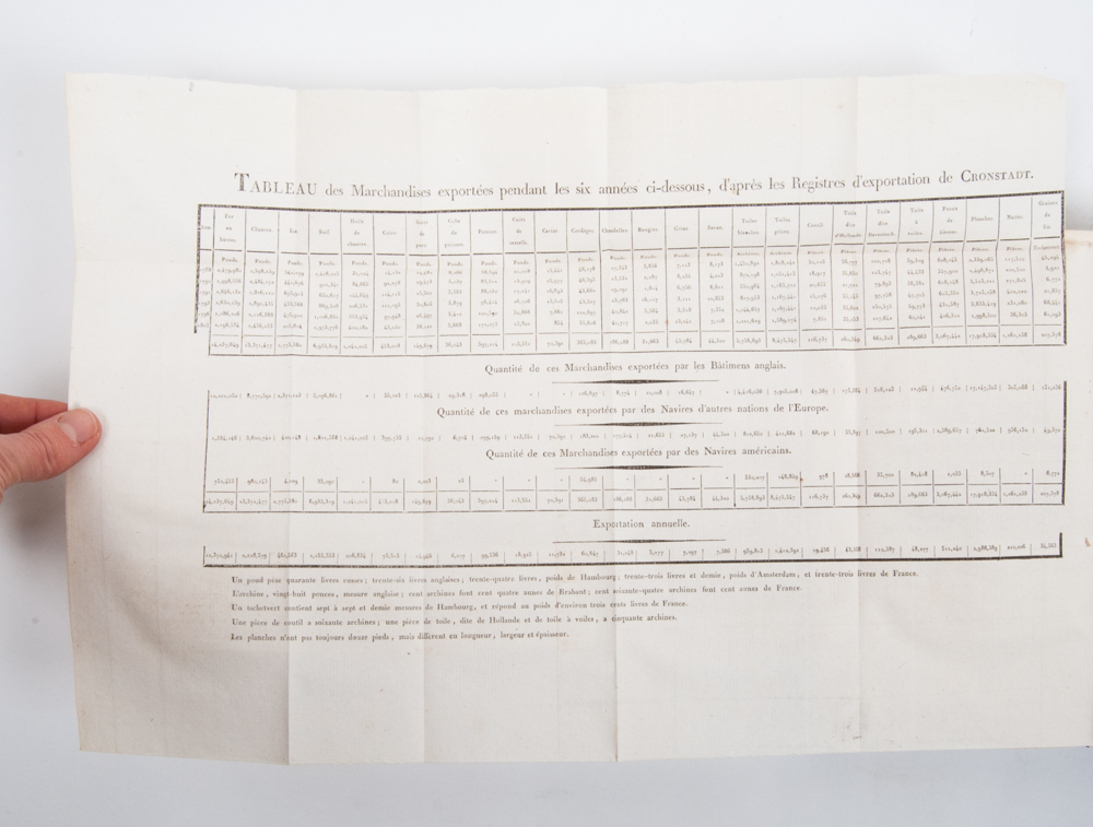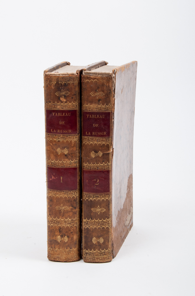 8vo, title on spine in red and gilt stamping, XVI,561,(1) and IV,456,(1) pp., marbled endpapers, complete with folding map of Russia in Europe by P. Lapie and J.B. Tardieu, 2 charming route maps, from Berlin to St. Petersburg with an explanation about this route on a folding leaf bound separately with it, a folding map of St. Petersburg and a smaller map of Moscow. The maps with coloured outlines, as well as the map of St. Petersburg, spine and boards damaged. (total 2)