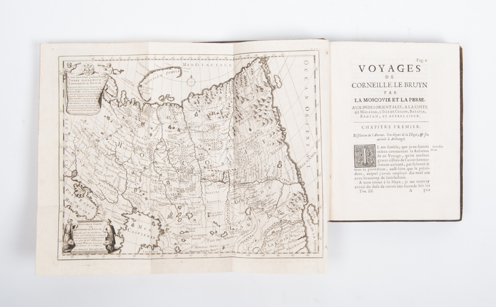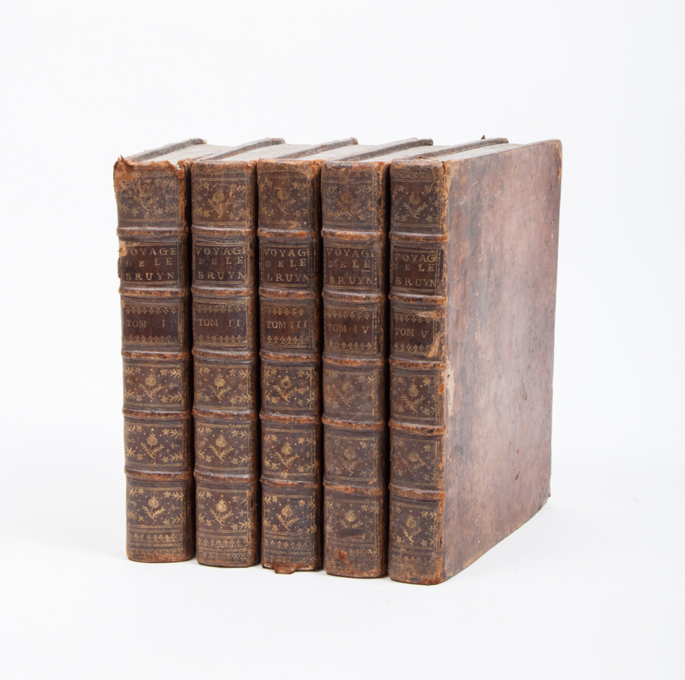 c'est--dire, dans les principaux endroits de l'Asie mineure, dans les isles de Chio, Rhodes, Chypre, &c. de méme dans les plus considérables villes d'Egypte, Syrie, & Terre Sainte (...) par Corneille Le Bruyn. Nouvelle édition. (I-II)/ Voyages par la Moscovie, en Perse et aux Indes orientales (...). Nouvelle édition. (III-V). Paris/Rouen, J.B.C. Bauche/C. Ferrand & R. Machuel, 1725, 5 vols., with engraved frontispiece portrait of the author, 5 folding engraved maps and numerous illustrations on 85 (folding) engraved plates, contemporary uniform marbled calf leather with gilt, ribbed back and blue marbled edges, 4to.