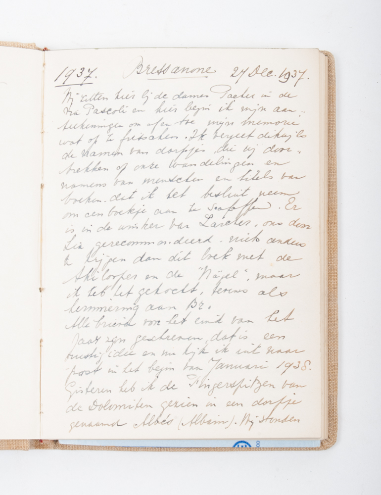 The writer of the diary (residing in Diepenveen) travels with her husband Henri (painter E. Henri W. Brandt Corstius (1871-?) and their daughter Lia. On the first page she mentions the reason to write the book: to remember the names of towns and people and the titles of books (indeed she comments on a whole variety of books in the diary). About her diary itself she writes below: “Er is in de winkel van Larcher (…) niets anders te krijgen dan dit boek met de skilooper en de Nägel, maar ik heb het gekocht, tevens als herinnering aan Br.” Furthermore their other daughter Els (married to Wim Went, working for “De Moderne Boekhandel”, together had a daughter, Christientje, born on 10 September 1939), and sons Lex and Chri are mentioned. Acquaintances include: the Van de Pol(l)s, Cor Breyer, Mrs. Van Doorninck from Olst-Boxbergen, Tineke Engelhard, mr.J. Beukers, the Widmanns, etc.