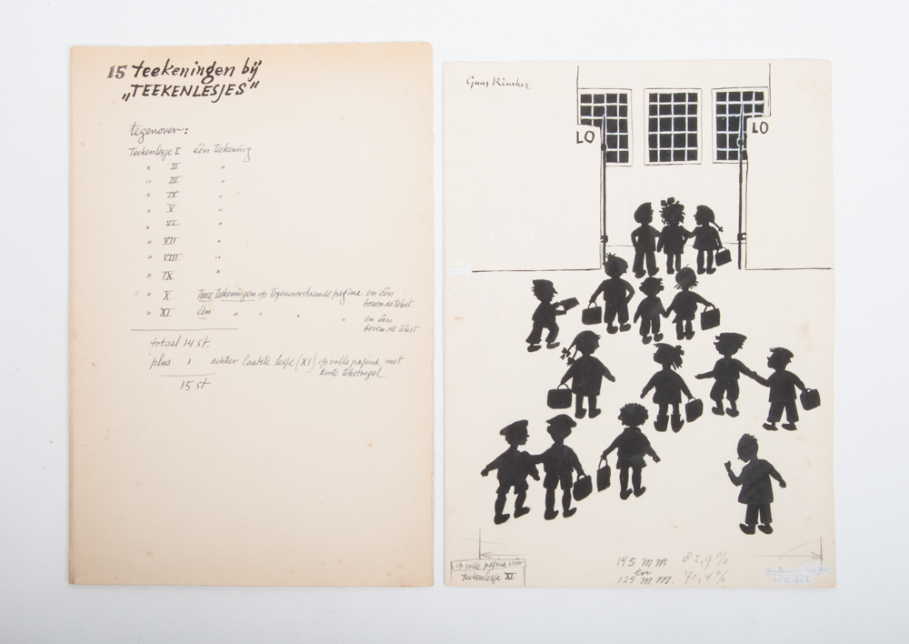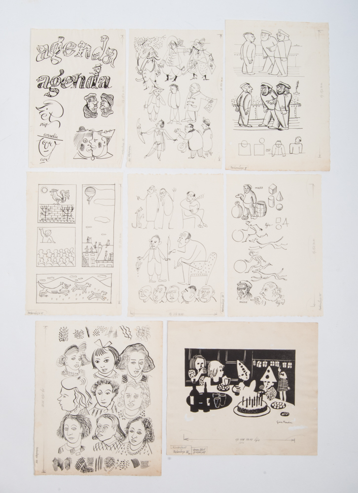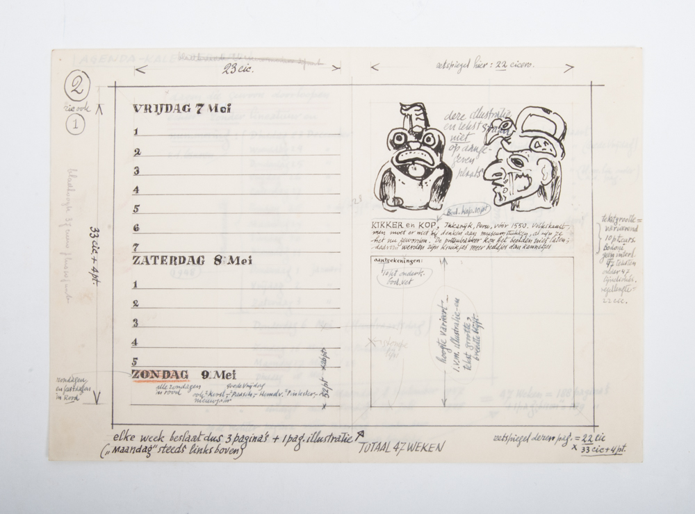 This folder provides an extraordinary insight into the production of a school agenda in the late '40s. Names of the artists involved appear only occasionally: several times the name Guus Rincker, once J. v. Vlierden and once a monogram W.J.R.