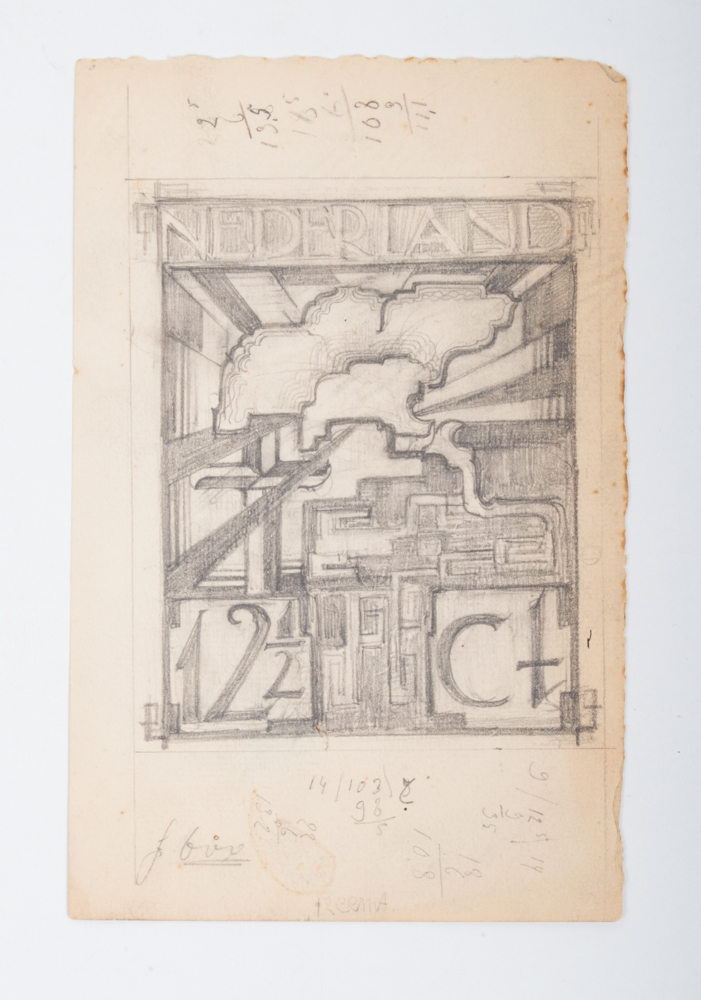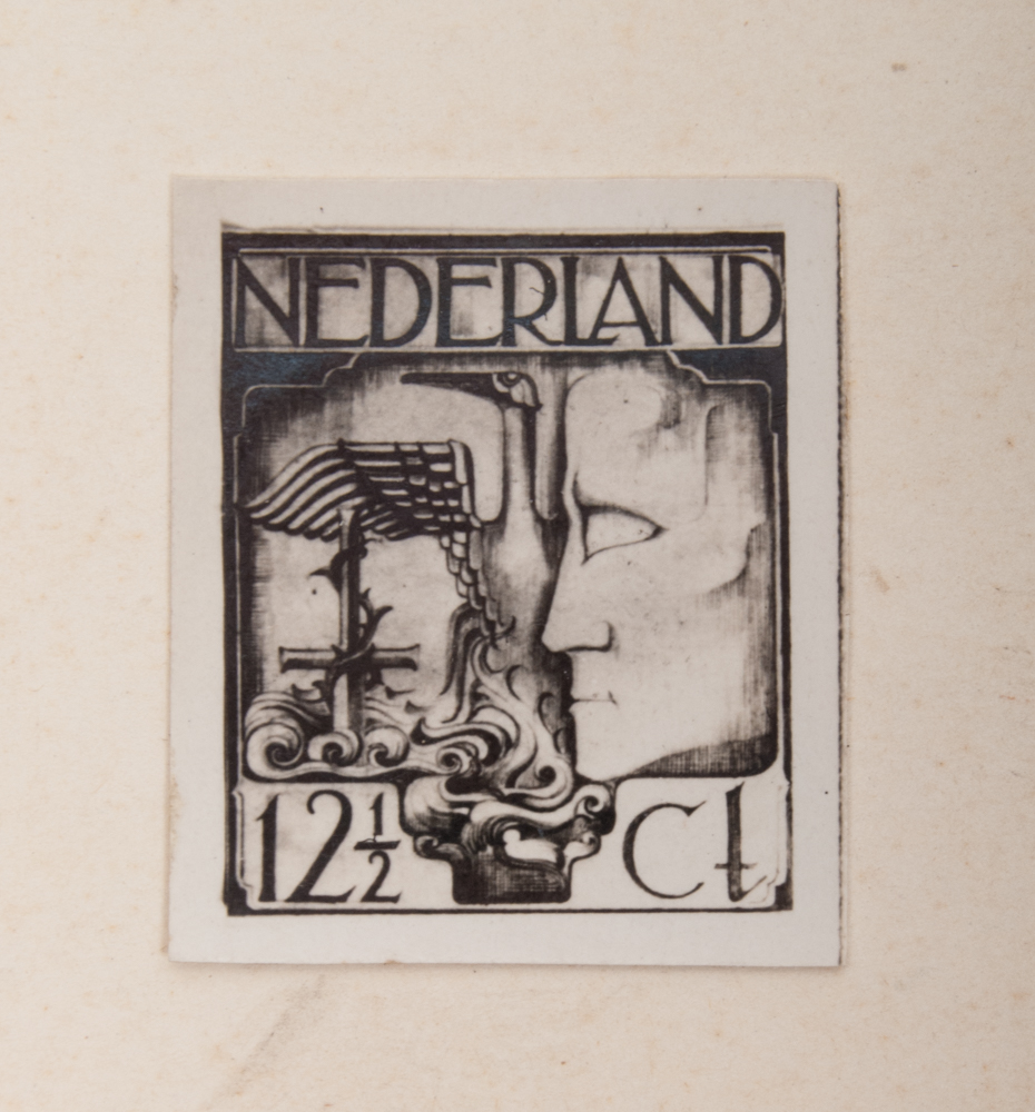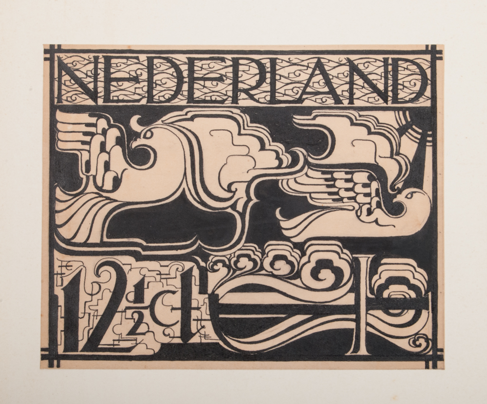 Original designs for Dutch stamps (ca. 1920) titled "bloom", "phoenix" and "disarmament" in pencil and India ink to be used for book printing and rotogravure.