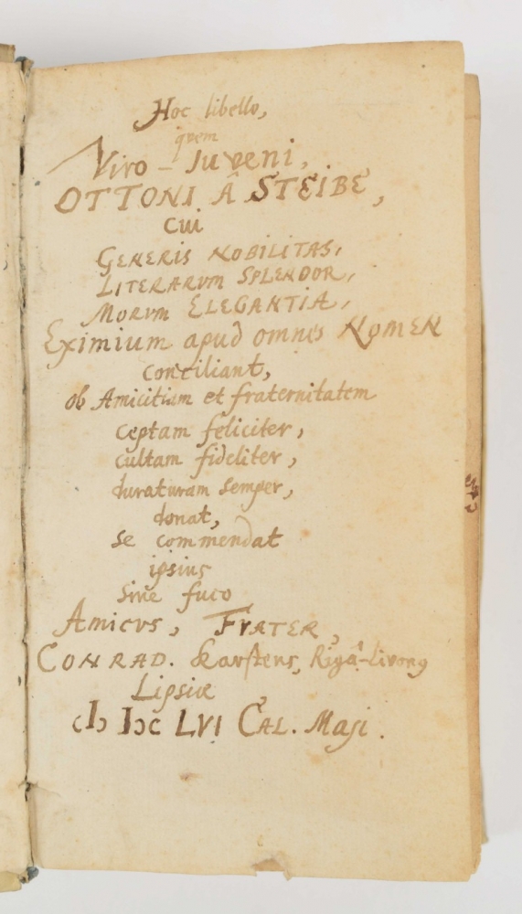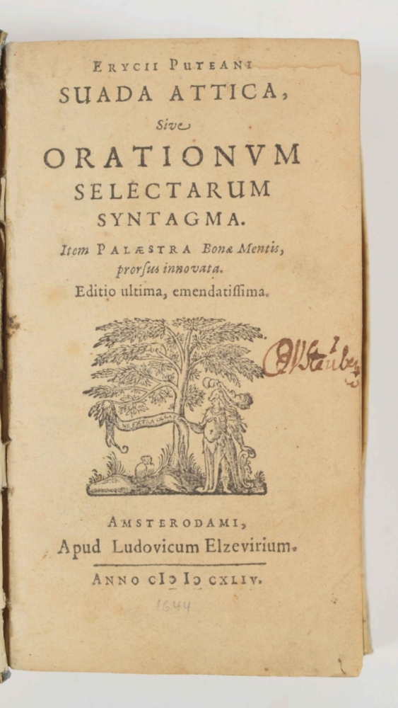 Item palaestra bonae mentis, prorsus innovata. Editio ultima, emendatissima. Amsterdam, Louis Elzevir, 1644. (24), 619, (1) pp. With woodcut publisher's device on title and manuscript presentation to Otto von Streiben on first free endpaper dated Leipzig, 1656. Overlapping vellum, title in ink on spine, 12mo.