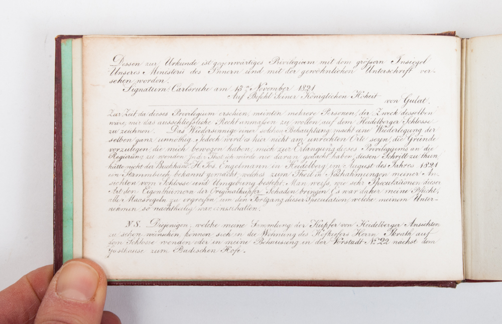 2 bindings, uniform binding, oblong (14 x 8.5 cm.), red morocco, title on spine in red and gilt stamping, front and back cover with floral embroidery, gilt-edged. Complete with 2 printer's privileges (Germand and French, at the front and back) and 36 lithos per binding. The lithos (5.5 x 10 cm.) and the leafs (8 x 13 cm.) all with protective leaf, endpaper vol. I with stain, lithos with small brown stains outside the image. All lithos with an explanation in German and French. Very interesting collection in fine bindings. (total 2)