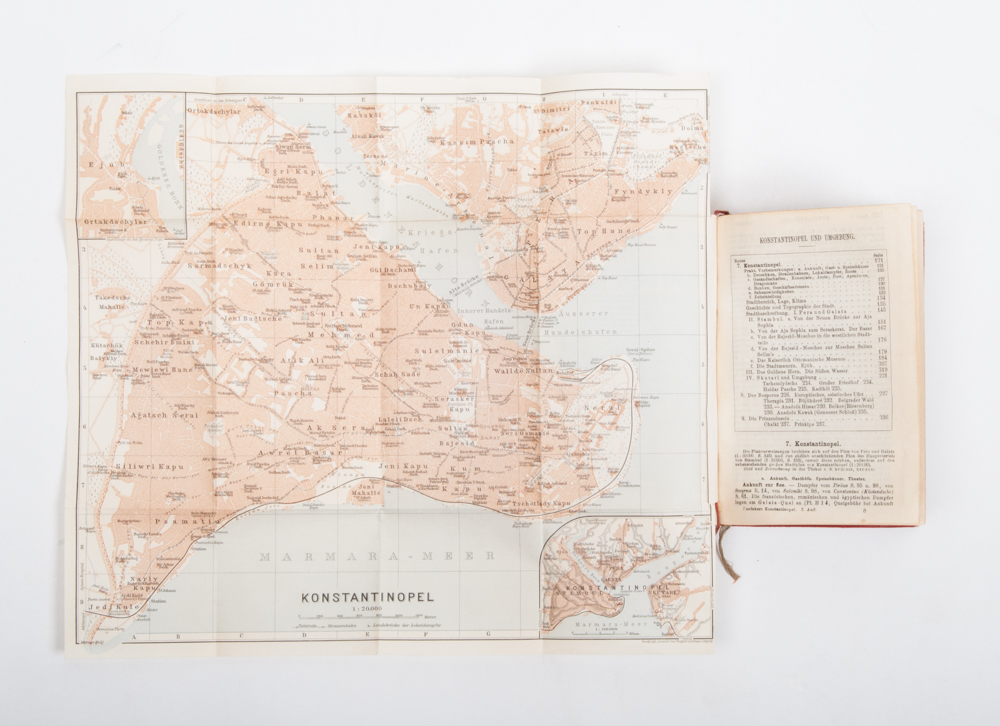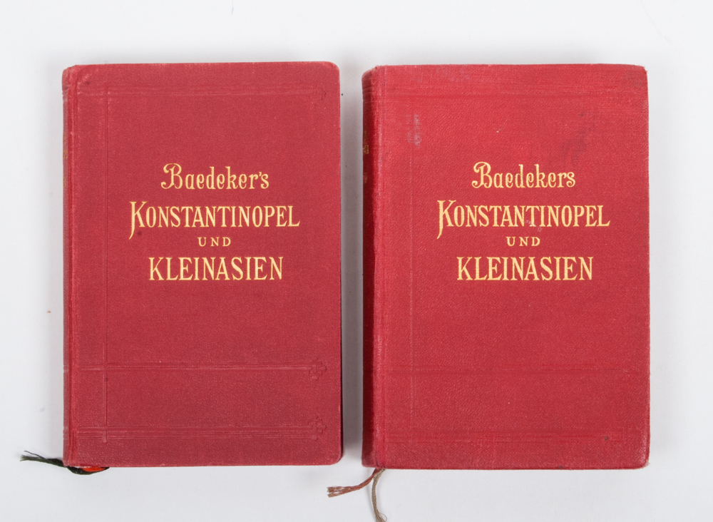 Handbuch für Reisende, Karl Baedeker, Leipzig, 1905. Red percale binding, title on spine and front cover in gilt stamping, xxiv, 275 pp., complete with 9 maps and 34 plans. An extra note at the front, separately affixed, advising that one hide this travel book in one's hand baggage when crossing the Turkish border in order to avoid Turkish censorship. Curious. Combined with Konstantinopel, Balkanstaaten, Kleinasien Archipel, Cypern, Karl Baedeker, Leipzig, 1914. 2nd much extended edition with owner's stamp. Complete with all maps and plans. Hinr. D497 and D498.
