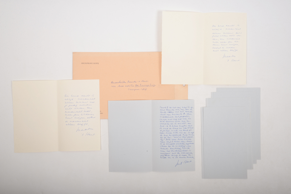 all written on individual pages, else of blank bifolia of laid paper, signed "Maarten 't Hart" (2x, white paper) and "M 't Hart" (5x, blue paper), unfolded ca. 19.4 x 24 cm., loose in envelope of B.V. Uitgeverijen Amsterdam.