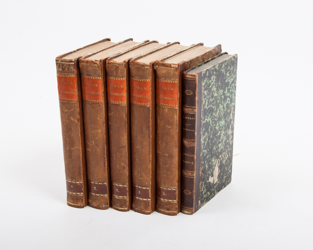 Uniform binding, 5 vols., 8vo, half leather, title on spine in red and gilt stamping. Complete series, 3 ex libris, bindings scratched, else good. Added: Verhandeling over het zamenstellen der geschiedenis (..) van ons vaderland, Frans van Mieris, (and) P.G. Witsen Geysbeek Amsterdam, G. Portielje, 1826.