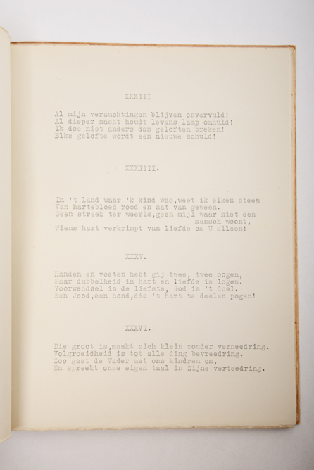 Original (?) typoscript consisting of title page and 27 leafs with 107 typed quatrains (recto only), on paper with watermark "Departement van Landbouw, Nijverheid en Handel", plain cover with faux leather spine, 23.5 x 18 cm.