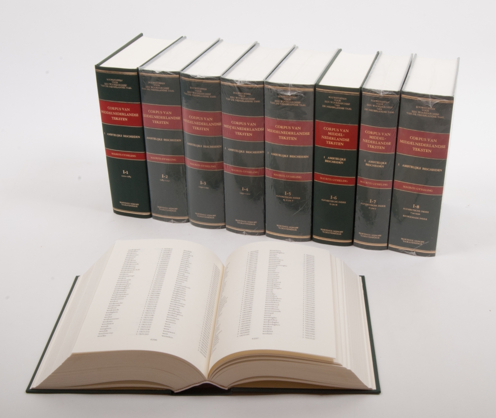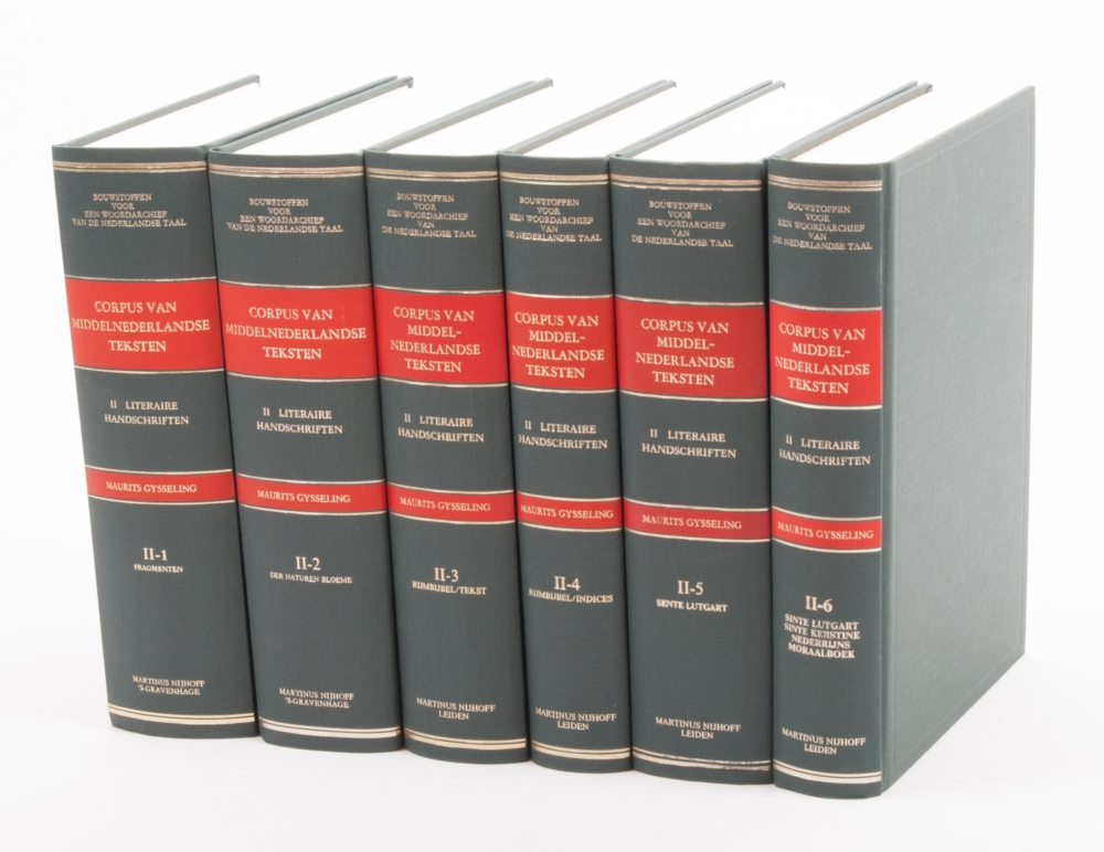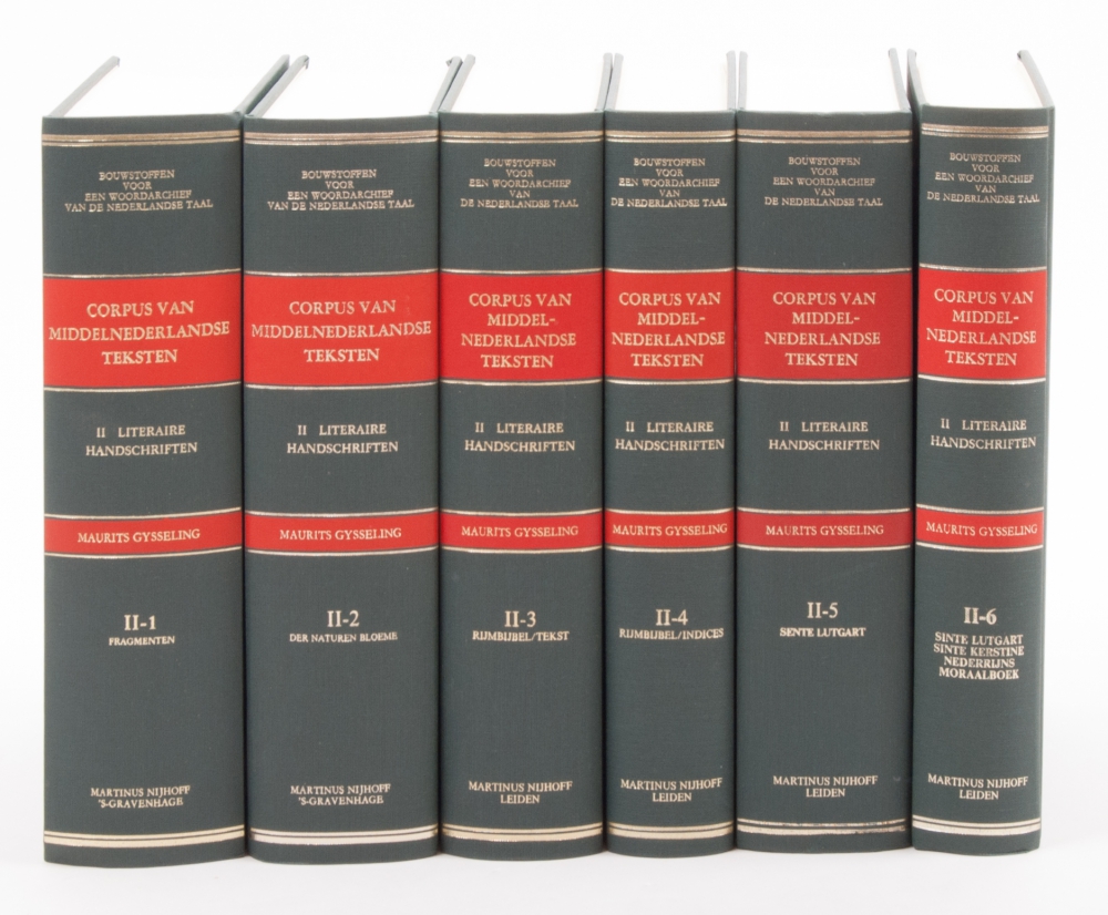 Maurits Gysseling, Willy Pijnenburg. Complete set consisting of Series I: Ambtelijke Bescheiden; vol. I-IX. Series II: Literaire Handschriften; vol. I-VI. Den Haag, Leiden, 1977-1987. 15 vols. Vol. I-IV: Texts of charters, securities, accounts, lists of goods etc. from 1210 to 1300. Vol. V-IX: Indices (retrograde, on word frequency and length). I: Literaire Fragmenten; II: Der Naturen Bloeme; III/IV: Rijmbijbel (Tekst en Indices); V: Sente Lutgart; VI: Sinte Lutgart /Sinte Kerstinne & Nederrijns Moraalboek.Bouwstoffen voor een woordarchief van de Nederlandse Taal.