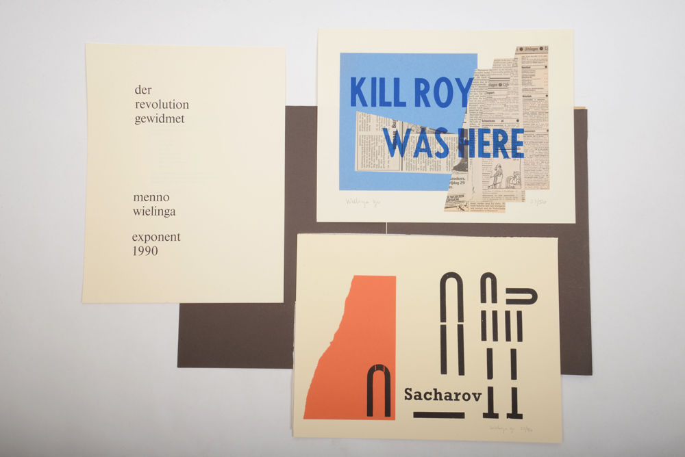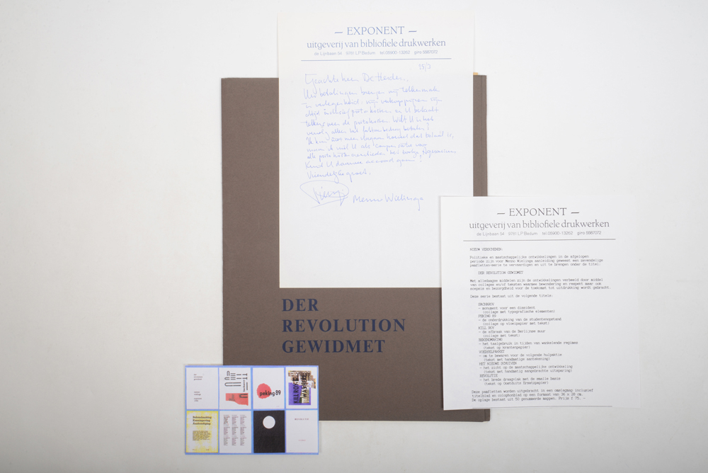 With: Der Revolution gewidmet. Menno Wielinga. Bedum, Exponent, 1990, printed in 50 numbered copies, letterpress colophon leaf and title page and 7 "pamphlets", loose as published in original paperboard cover, folio (each "pamphlet" signed "Wielinga '90" and numbered "23/50").