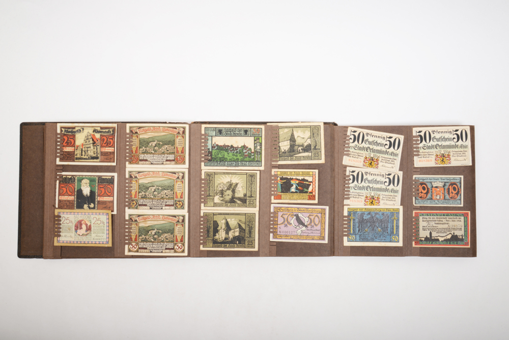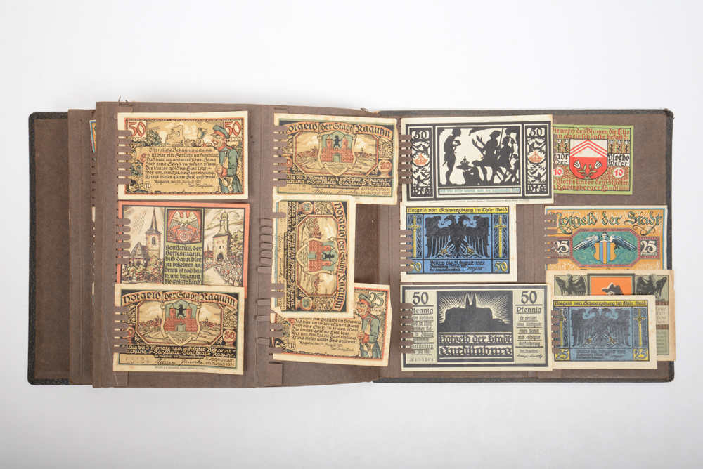 Album with 180 inserted pieces of Notgeld (emergency money), including doubles, mostly 1921, the contents of the album (15 leafs) foldable as leporello (length almost 4 metre) with the Notgeld on both sides, original gilt lettered paperboard, oblong 4to.