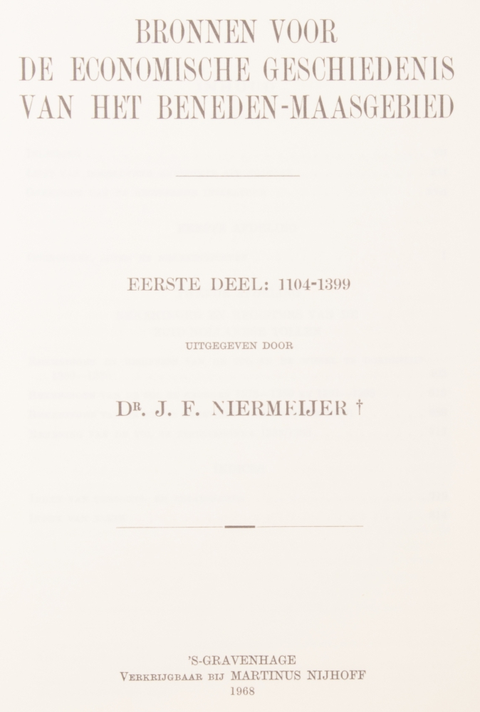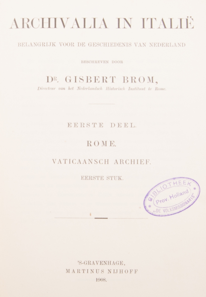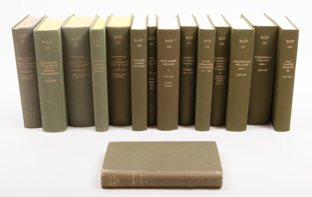 Published by the Instituut voor Nederlandse Geschiedenis, Den Haag, 1946-1998, from this series 14 vols. incl. Bronnen tot de bouwgeschiedenis van den Dom te Utrecht, 2nd vol., 1st, 2nd and 3rd part; Bronnen voor de economische geschiedenis van het Beneden-Maasgebied, vol. 1 and 2; Bronnen voor de geschiedenis der dagvaarten van de Staten en steden van Holland voor 1544, vol. 1, 1st and 2nd part, and vol. 3. Added: Vol. 2 from the small series: Archivalia in Italië, first part, Rome, Vatican Archives.