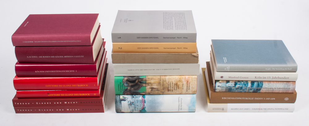 Geschichte des Landes Oldenburg, Eckhardt, Schmidt, Heinz Holzberg Verlag, Oldenburg, 1987 + Gottorf im Glanz des Barock (2 vols.), S.H. Landesmuseum, Schleswig, 1997 + Glaube und Macht. Sachsen in Europa der Reformationszeit (2 vols.), Sächsisches Landesausstellung. Michel Sandstein Verlag, Dresden, 2004 + Der Sassen Speyghel. Bilderhandschriften des Sachsenspiegels. Niederdeutsche Sachsenspiegel (2 vols.), Idensee Verlag, Oldenburg, 1995 + Köln, geschiedenis en Universiteit (5 vols.) + 4 others.