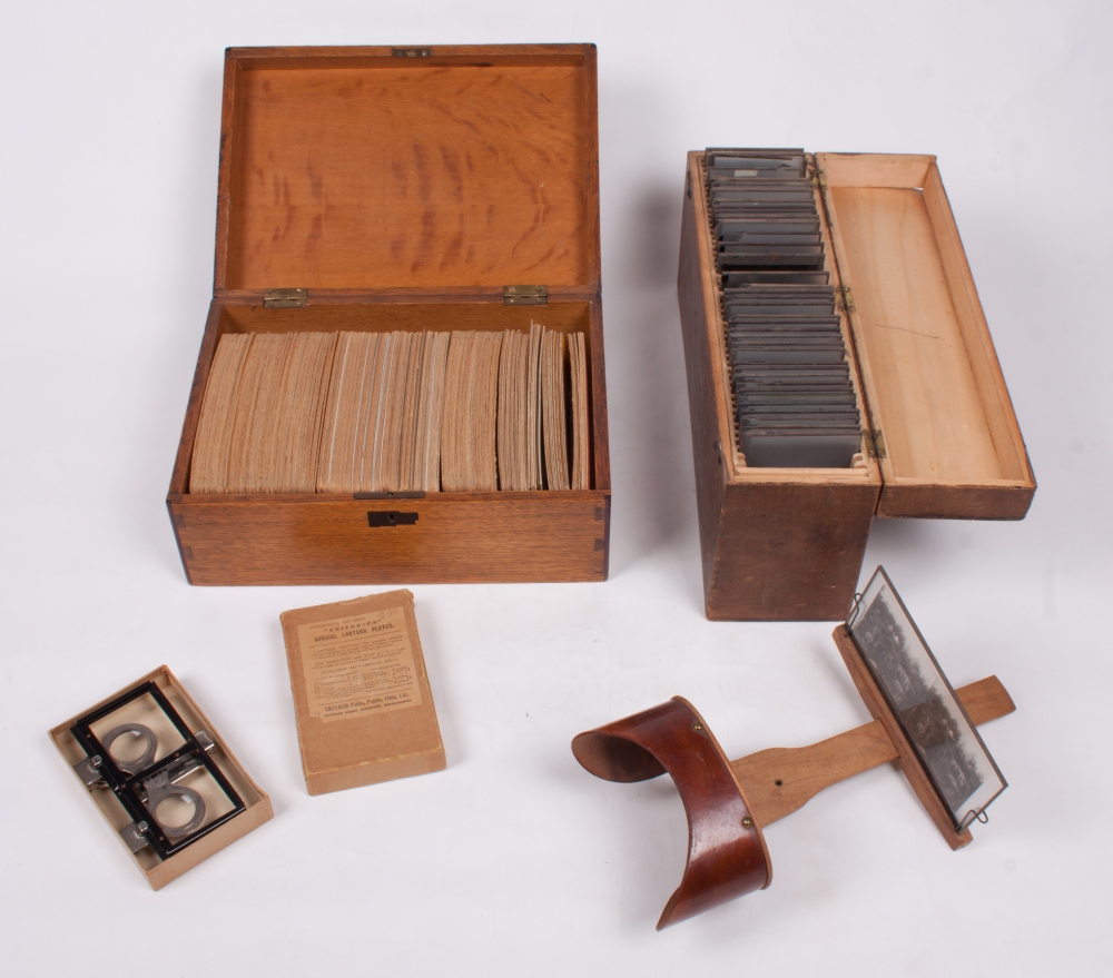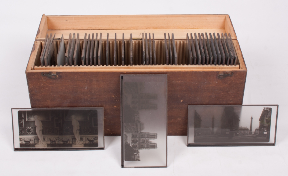 With: collection of 229 cardboard stereo photos in wooden box, all ca. 9 x 18 cm., incl. (numbered) series concerning Algeria (66), Algiers (28) and family snapshots (76) and with 38 glass stereo photos in wooden box. Finally with a foldable metal stereoscope (marked Unis, Paris). (total 2 stereoscopes and two boxes of stereo photos)