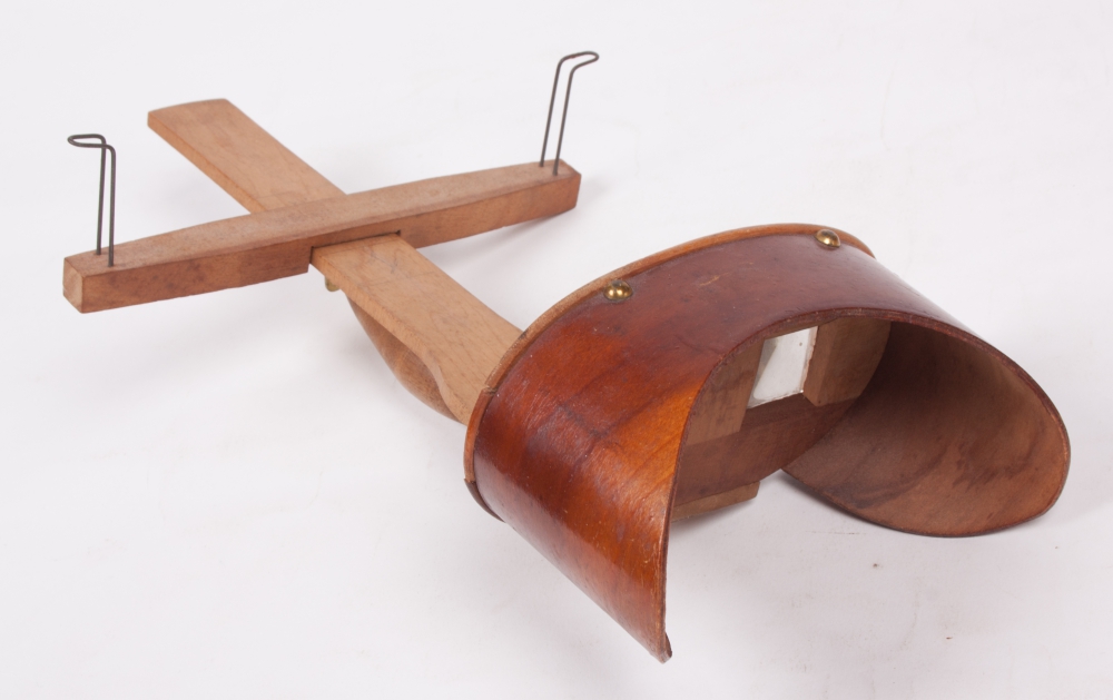 mahogany and oak, hand-held model with two square polished lenses, movable photo holder and foldable grip, length 32 cm.