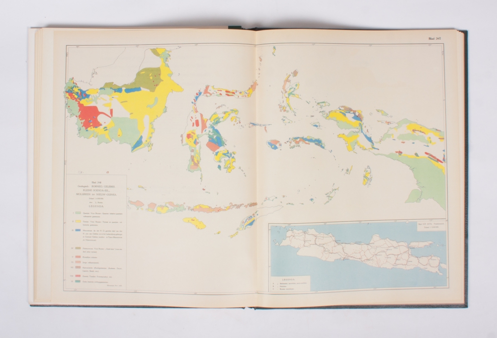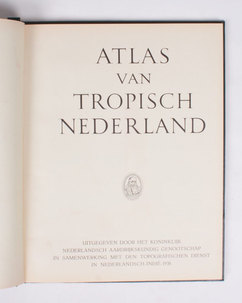 With: Atlas van Tropisch Nederland. Amsterdam, KNAG/Topographischen Dienst in Nederlands Indië, 1938, first ed., 9 text p., 31 plates with 70 (double-page) coloured maps, tipped-in index (17 p.), original faux leather, large folio (very good copy) and with 1 other. (total 3)