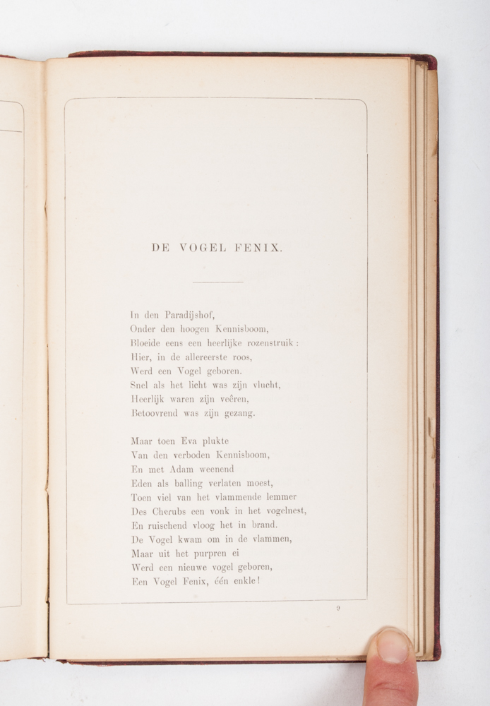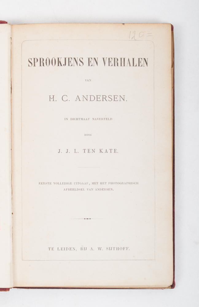 Ten Kate Sprookjens en verhalen van H.C. Andersen. Eerste volledige uitgaaf, met het photographisch afbeeldsel van Andersen. Leiden, A.W. Sijthoff, 1868. In orig. cloth with gilt stamping. Minimal wear, good copy + Gellert's Fabelen en vertelsels. Vrij herzien door J. Schenkman. With (7) Plates. Amsterdam, G. Theod. Bom, 1854. 145 pp. Bound in cloth with gilt stamping. At endpapers inside fairly sloppy restoration.
