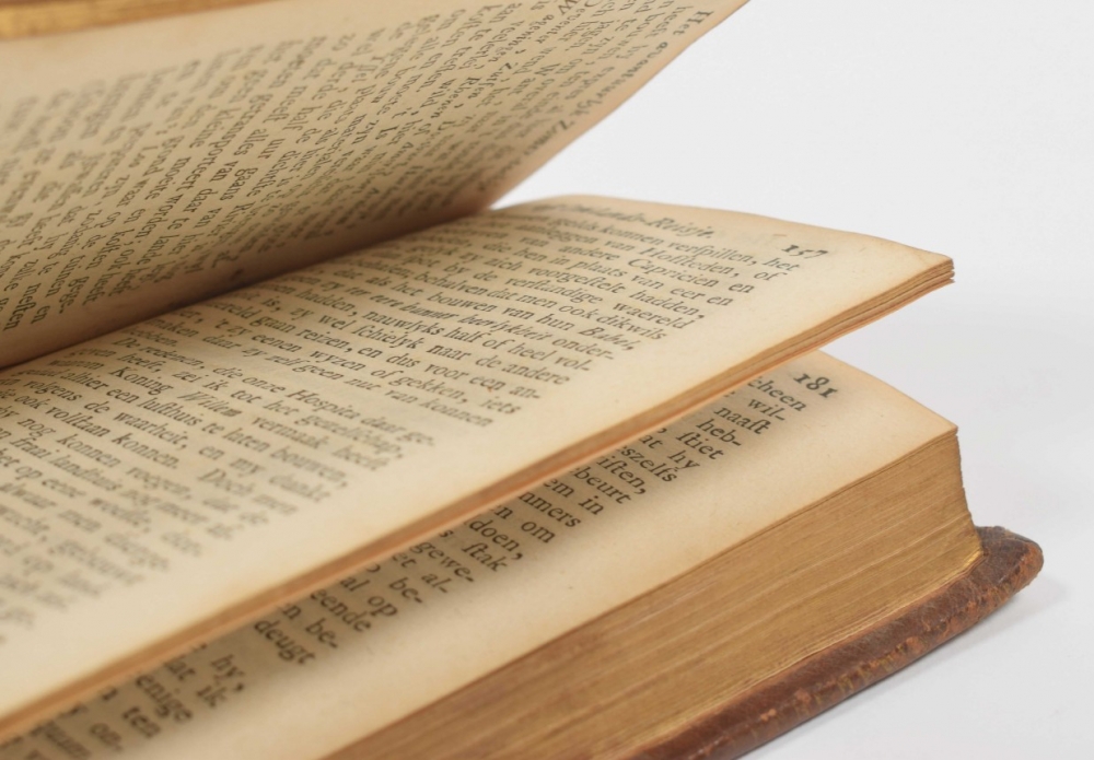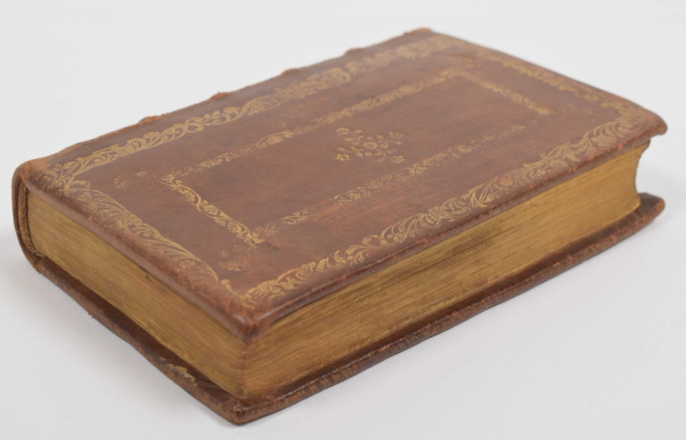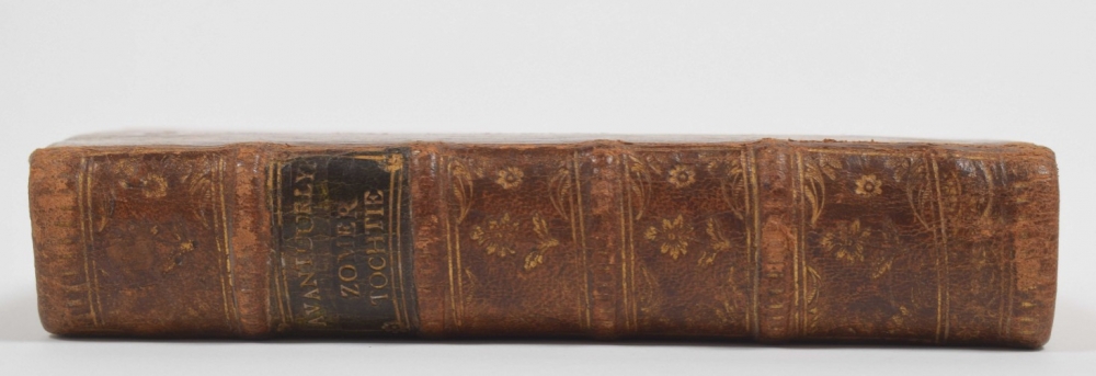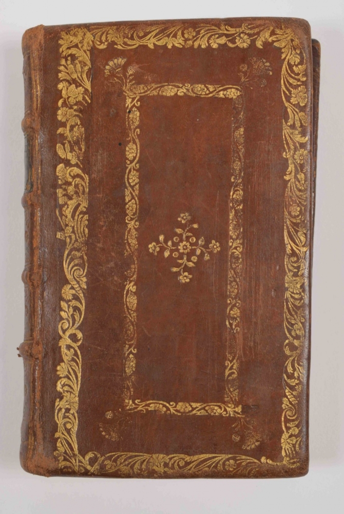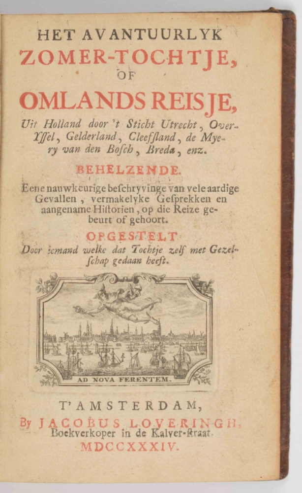 of omlands reisje, uit Holland door 't sticht Utrecht, Over-Yssel, Gelderland, (...) vermakelyke gesprekken en aangename historien, op die reize gebeurt of gehoort. Opgestelt door iemand welke dat tochtje zelf met gezelschap gedaan heeft. Amsterdam, Jacobus Loveringh, 1734. (6), 439 pp. Engraved printer's device on title page. Leather, richly gilt boards, ribbed gilt spine with title vignette, gilt edges, 8vo.