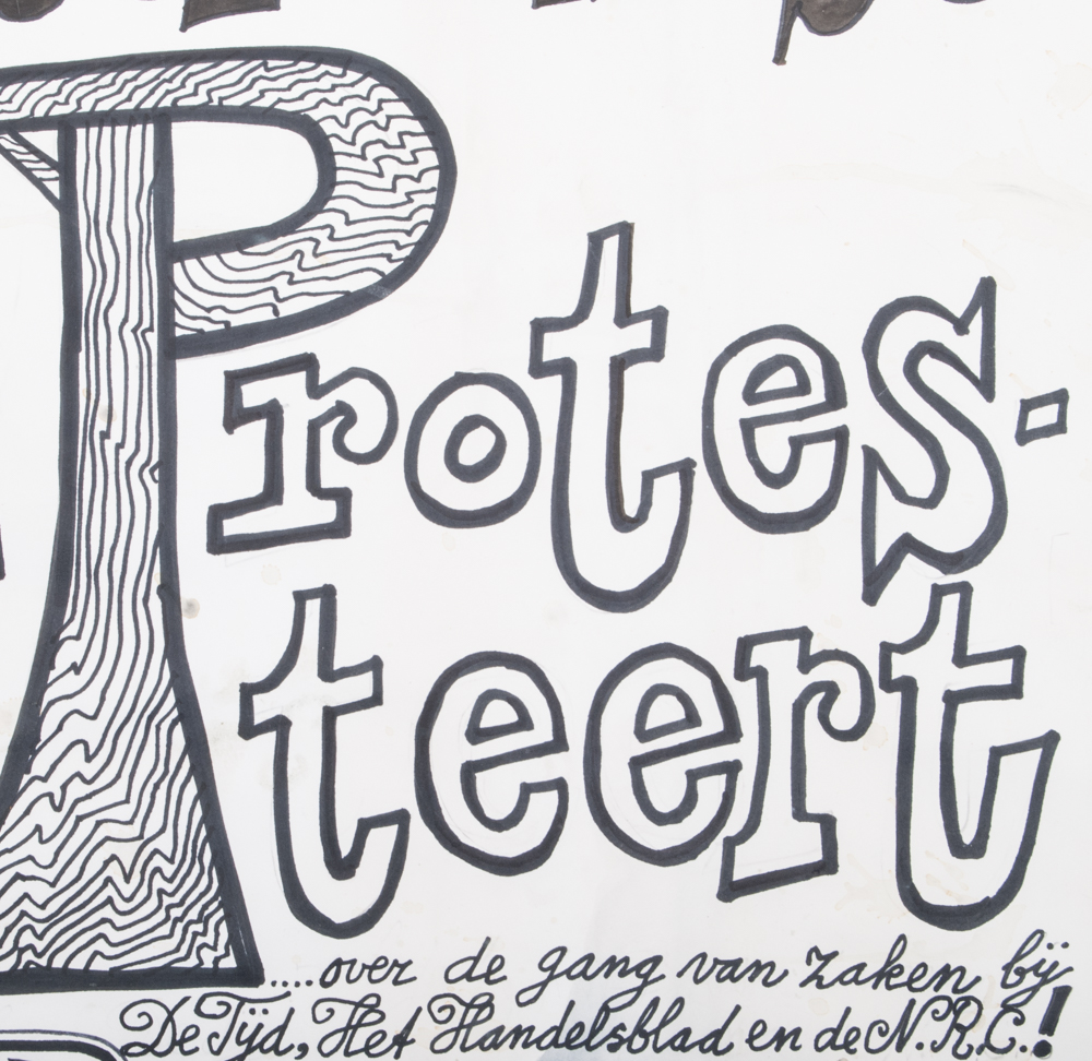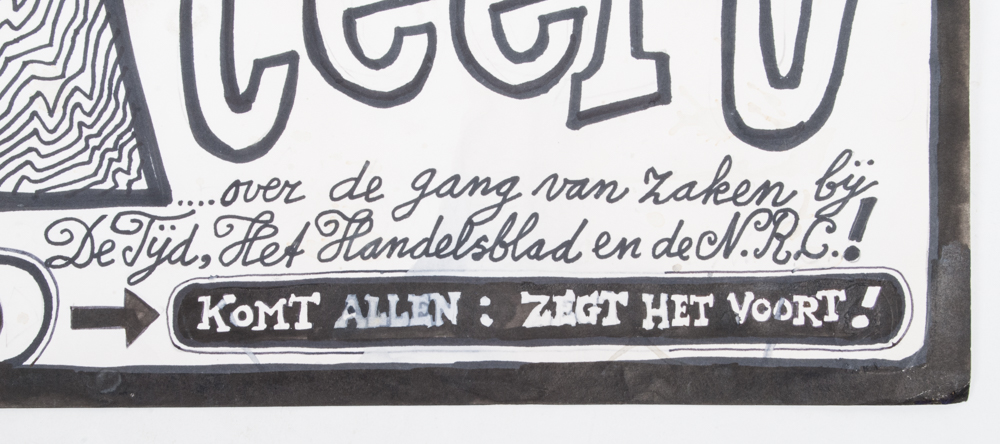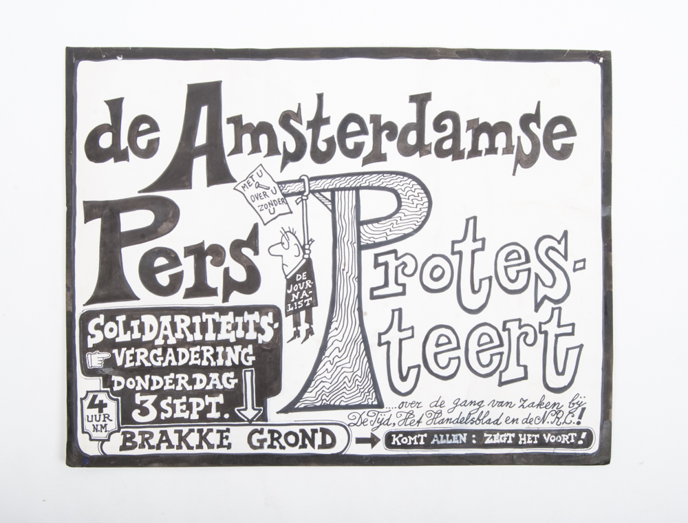 De Amsterdamse Pers Protesteert....over de gang van zaken bij De Tijd, Het Handelsblad en de N.R.C.! Solidariteits-vergadering donderdag 3 sept. (1970) Brakke Grond. Original drawing in black felt-tip pen for a poster. 50 x 64 cm. Unsigned.