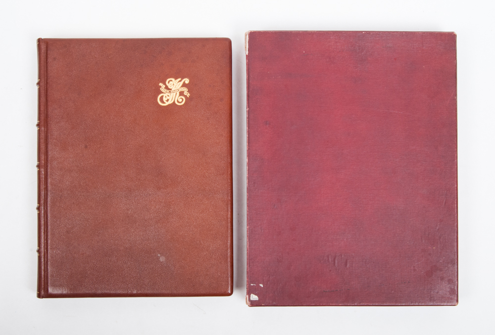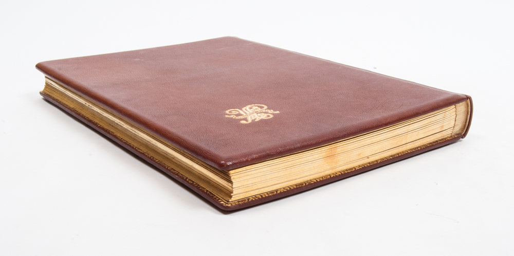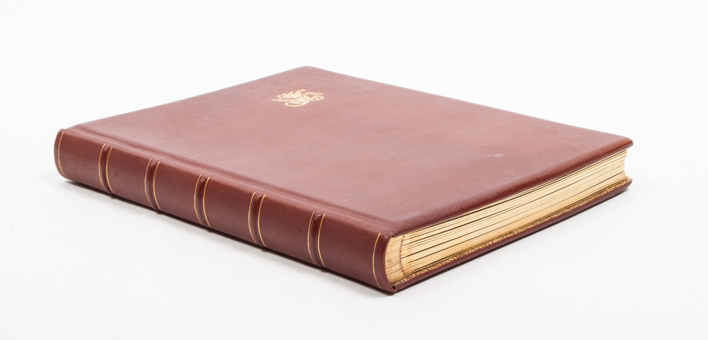 ca. 1930, interior with 16 thick paperboard leafs with space for 6 photos of 8 x 14 cm. on each leaf, marked with silk corners, front cover with gilt monogram "KJ" with motto "Klein maar trouw", inside boards and edges gilt, folio, in cloth box.