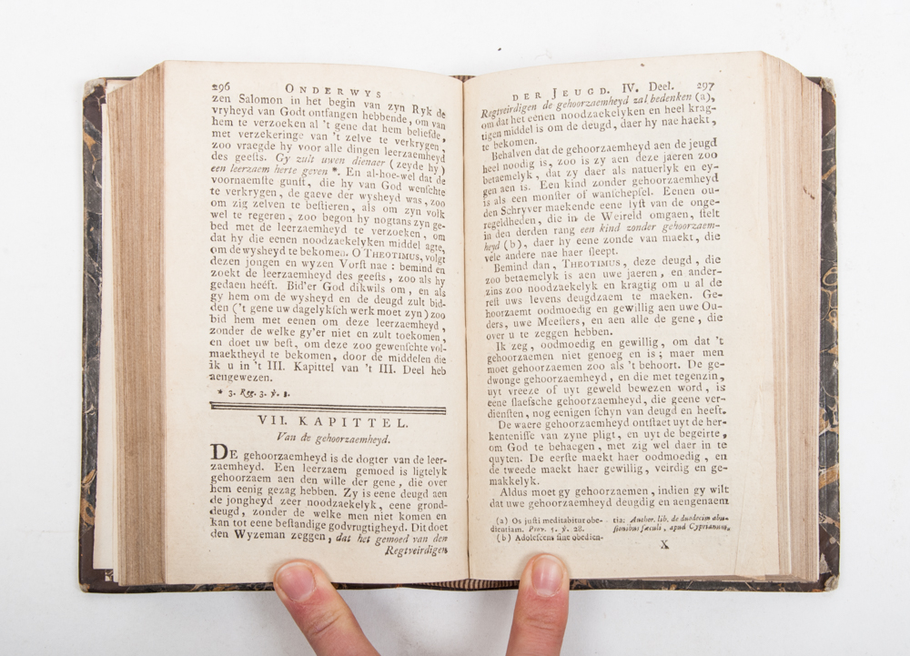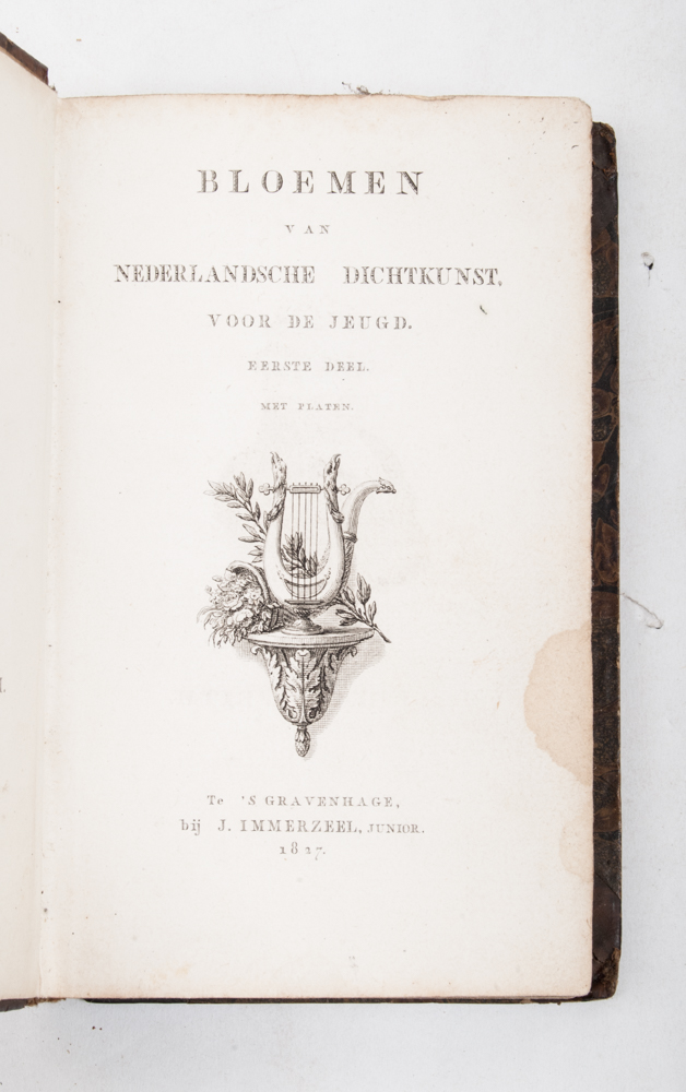 Bloemen van Nederlandsche dichtkunst voor de jeugd. Met platen. Samengesteld door A.J. Lastdrager en D. Ouwersloot. J. Immerzeel , Junior. Amsterdam. 1827. Small 8vo. 2 vols. in one binding. vii, 198, viii, 195 (1) pp. Title vignettes. Portraits of Mr. Rhijnvis Feith and M. W. Bilderdijk. Per vol. 2 plates. Signs of use. Illustrated historical poetry with images such as: Rembrandt's successful journey, The capture of Den Briel and Jan van Schaffelaar + G. Engelberts Gerrits, Keur van gedenkwaardige tafereelen uit de Noord- en Zuid-Nederlandsche geschiedenis voor de vaderlandsche jeugd en scholen. New edition. G. Portielje. Amsterdam. 1828-1830. Small 8vo. Four parts in one binding. xii, 161, viii, 167, viii, 164, iv, 145 (1) pp. Publisher's advertising. Contemporary marbled cased binding with leather spine. 4 title vignettes. Cracked spine. Inside in good condition. The last of the schoolbooks to present the history of the Netherlands and Belgium as the history of one fatherland to children? + M. Karel Gobinet, Priester, Doctor van de Sorbonne, enz. Onderwys der jeugd in de christelyke godvrugtigheyd, getrokken uyt de H. Schrifture en d’HH. Vaders. Uit het Fransch vertaeld en in dezen laetsten druk zeer verbeterd, en met deszelfs Latynsche citatien verrykt. P.J. Hanicq, Boekdrukker. Tot Mechelen. Met Approbatie. n.d. [ca 1835]. Small 8vo. xxiv, 565, iii, (3) pp. Publisher's advertising. Contemporary marbled cased binding with gilt-stamped leather spine. Marbled paper inside. Affixed: 2de Classe. 1sten Prys der Christelijke Leering in onze-Lieve-Vrouwe Kerk; Behaald door Aloysa Ommeganck. Antwerpen 29 7den 1839. Good condition.